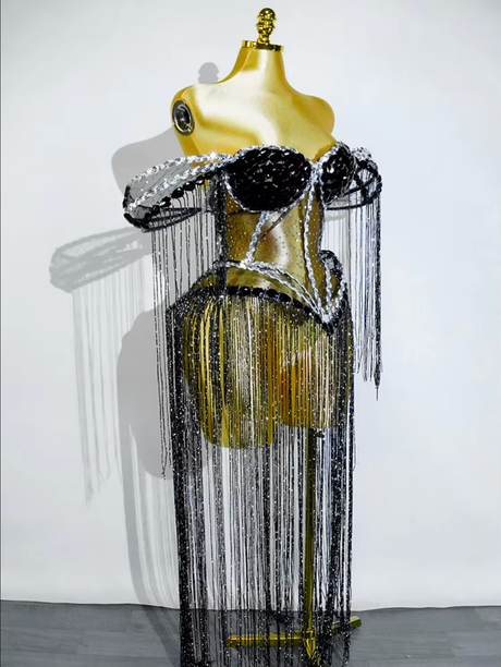 Sexy black tassel Dress with sparkling crystals. Perfect for gogo dancers, nightclub parties, birthdays, carnivals, and singer stage performances.