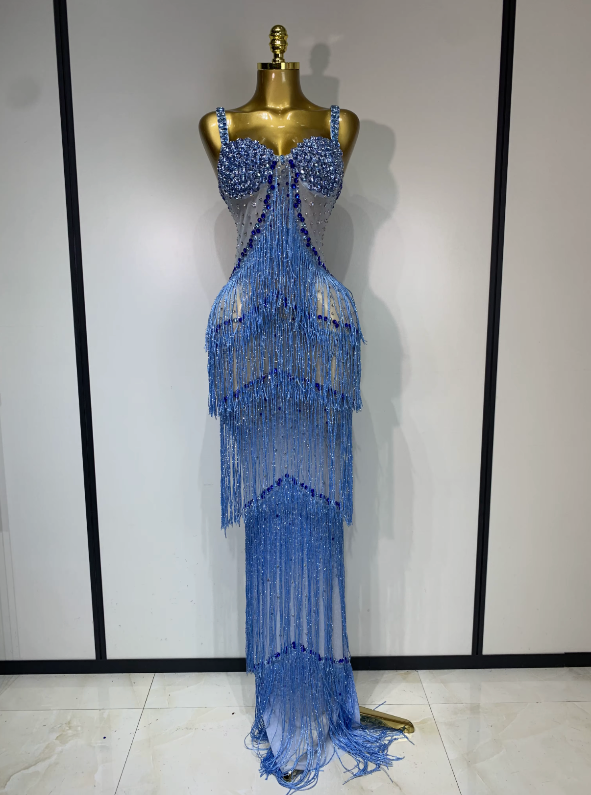 The crystal-embellished fringe moves beautifully with every step, making it ideal for performances, red-carpet moments, galas, and upscale parties. Crafted for comfort and elegance, this blue maxi gown delivers a flattering silhouette while catching the light effortlessly.