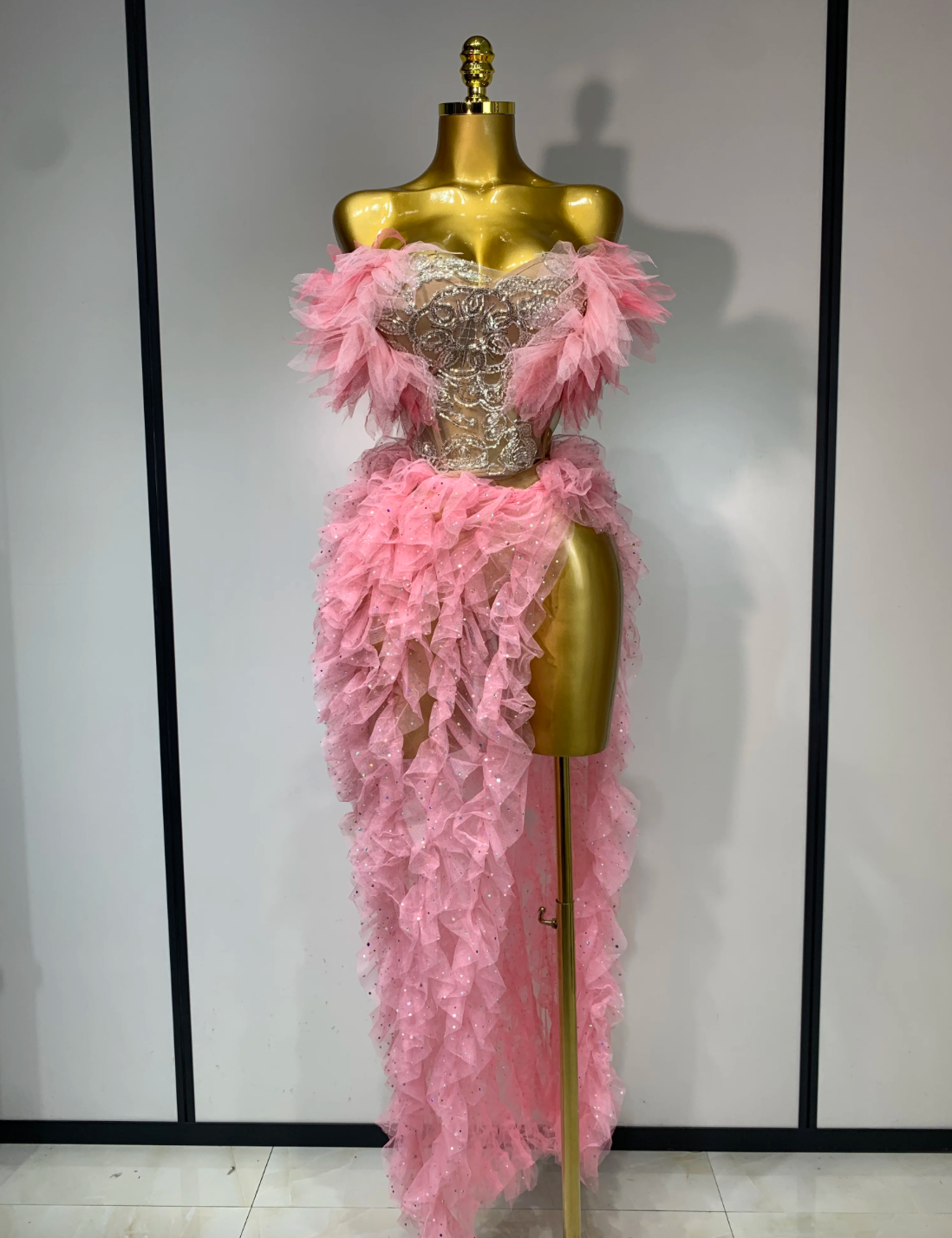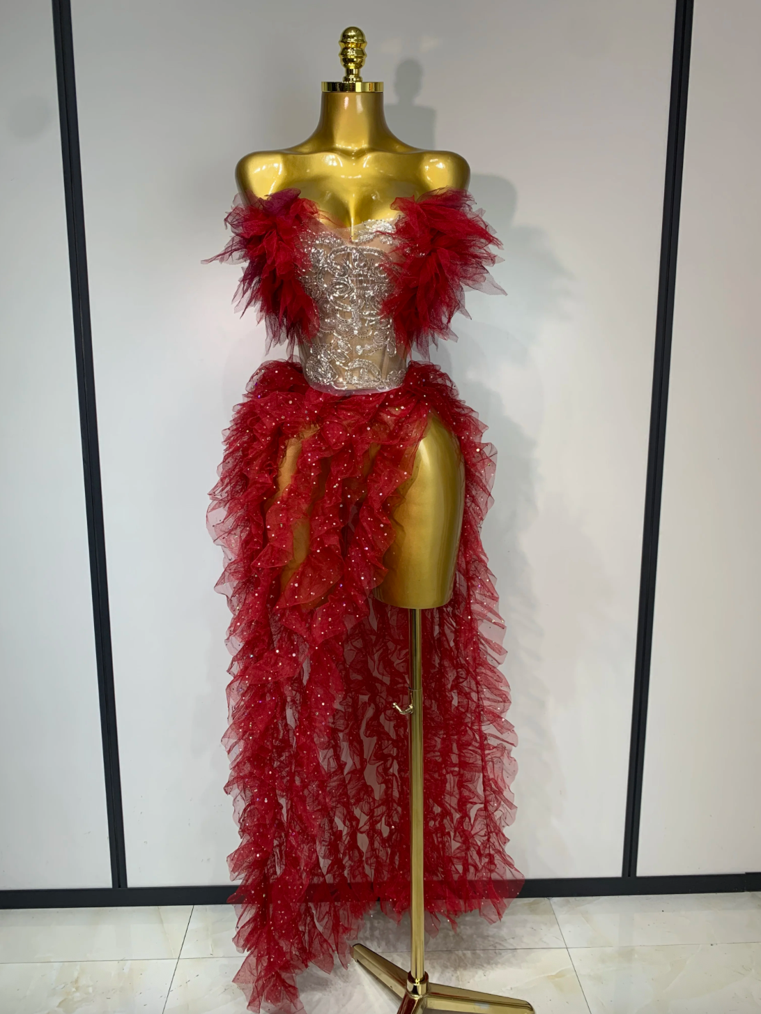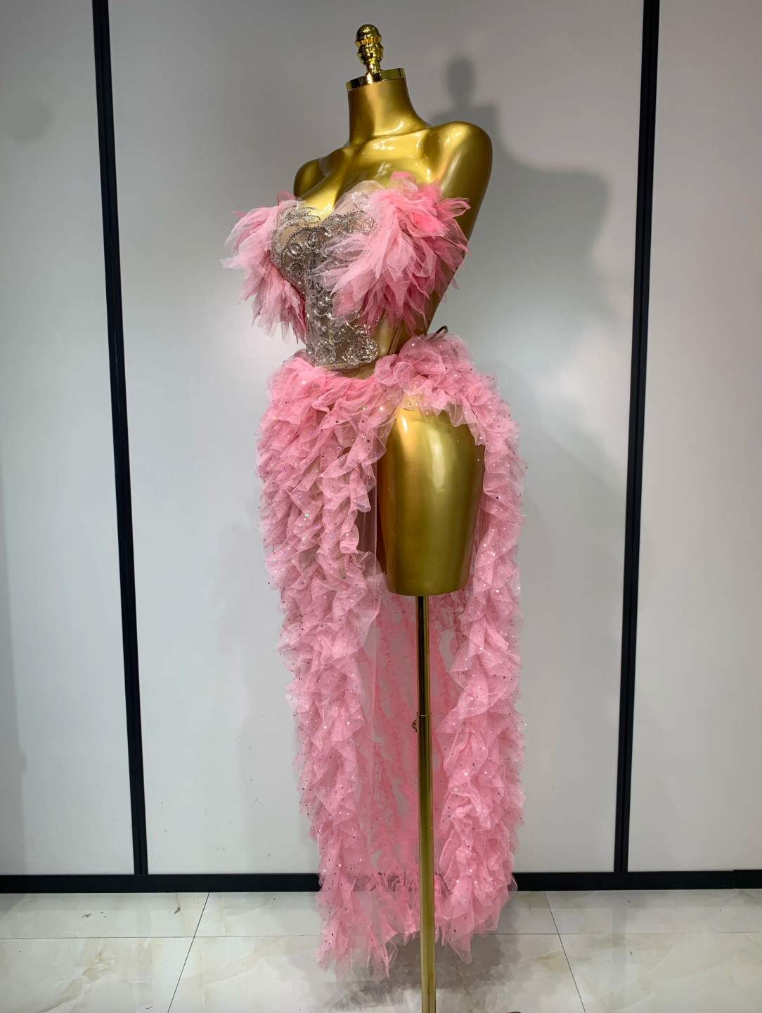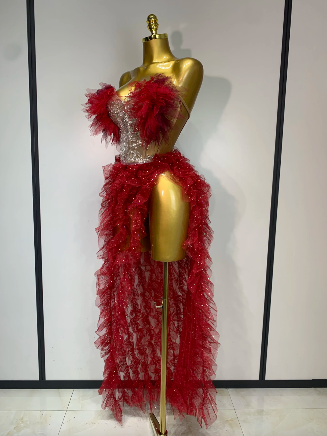 Women Sexy Strapless Ruffles two Pieces Set Bodycon Long Dress High Split Fashion Nightclub Party Birthday Singer Stage Outfit