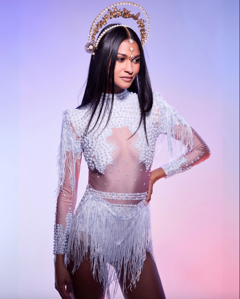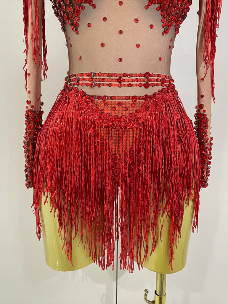 Ready to Ship Dance Performance Costume Bodysuit with fringe skirt headdress optional.