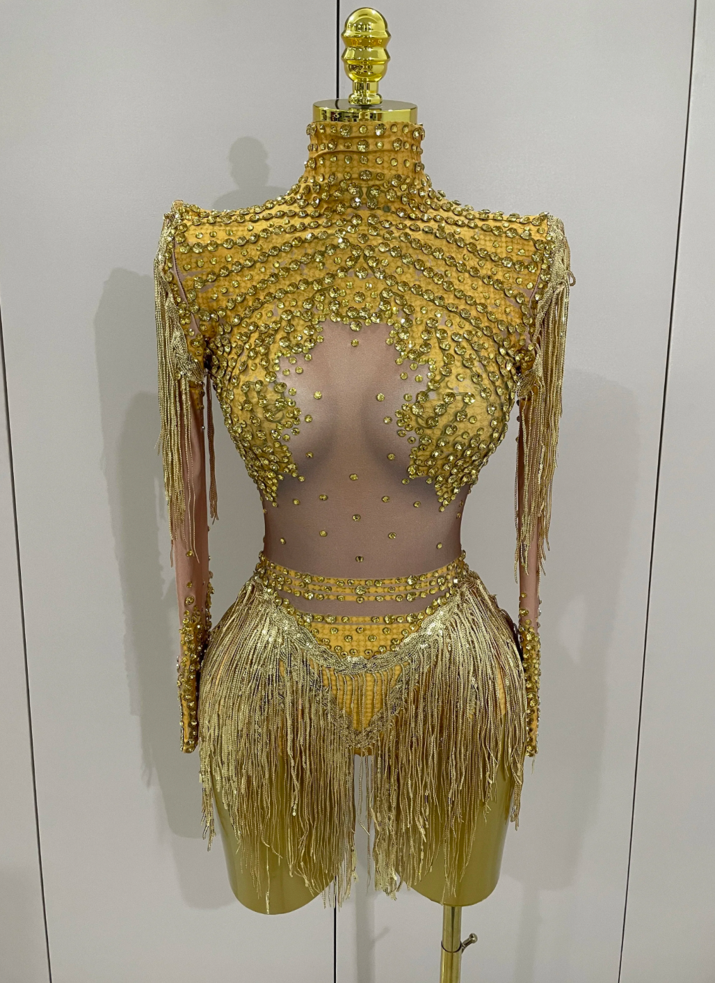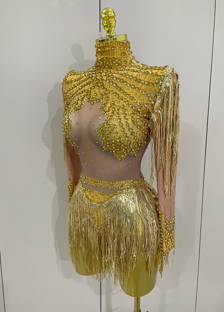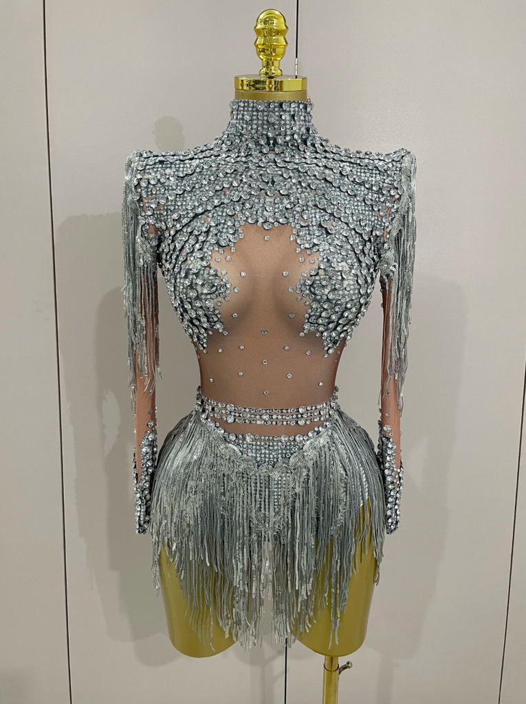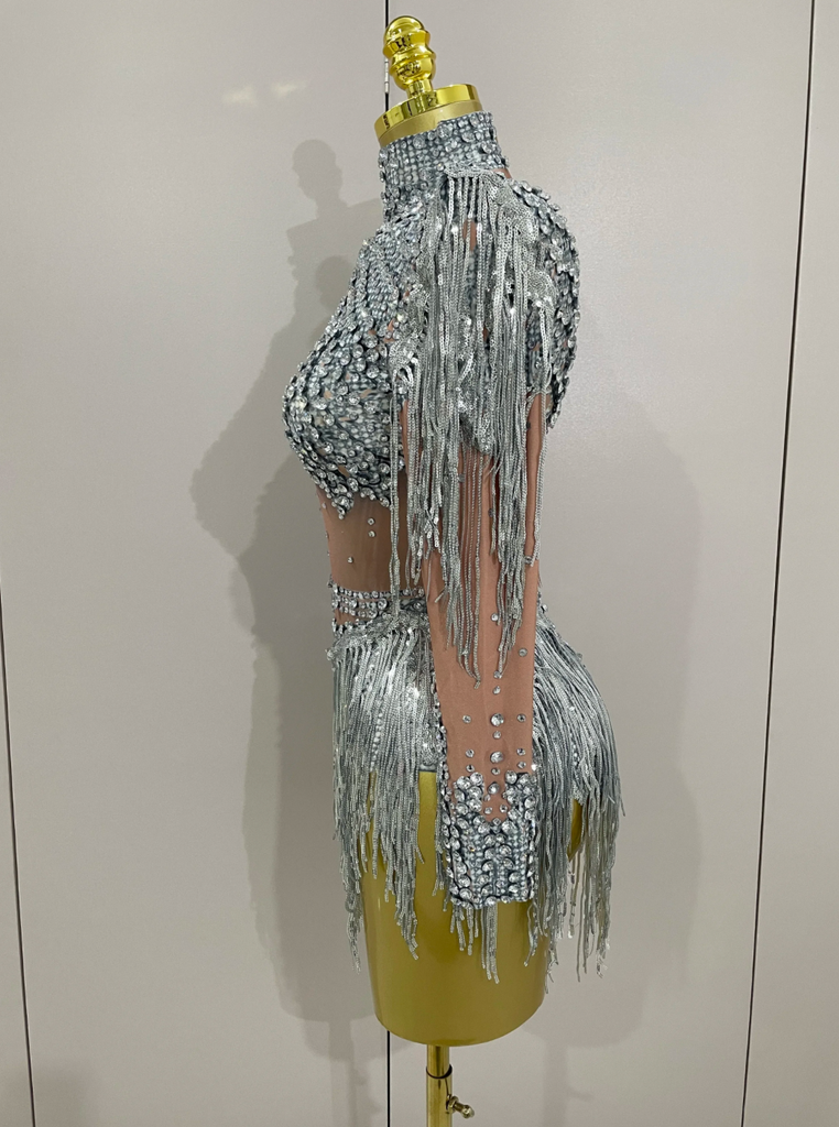 Silver Dress Gold Dress Sequin Tassel Stretch Bodysuit Party Dress Latin Dance Stage Wear Nightclub DJ Singer Dance Costume