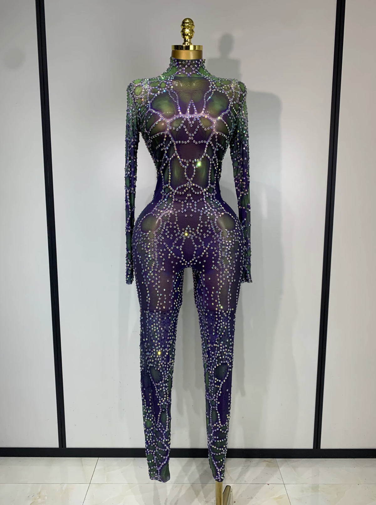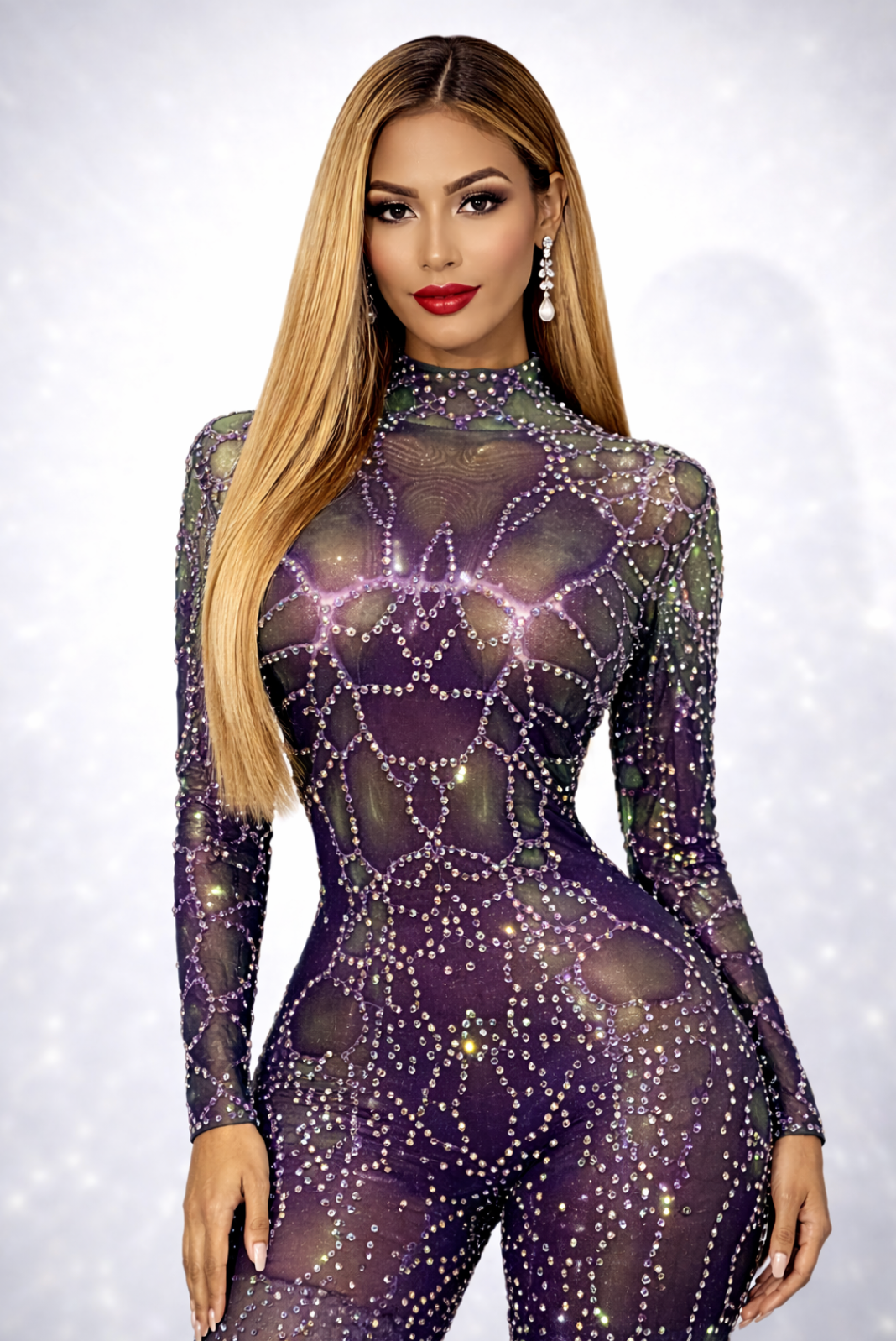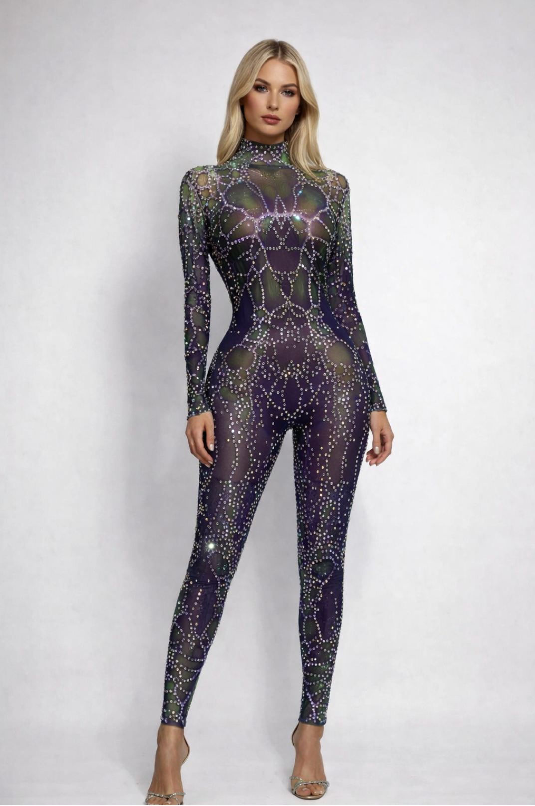 Step into radiant style with this shimmering festival and rave jumpsuit, designed to combine bold sparkle with elegant movement. Crafted to catch the light from every angle, this jumpsuit delivers a confident, show-stopping look for high-energy events and spotlight moments. Galaxy rhinestones jumpsuit.