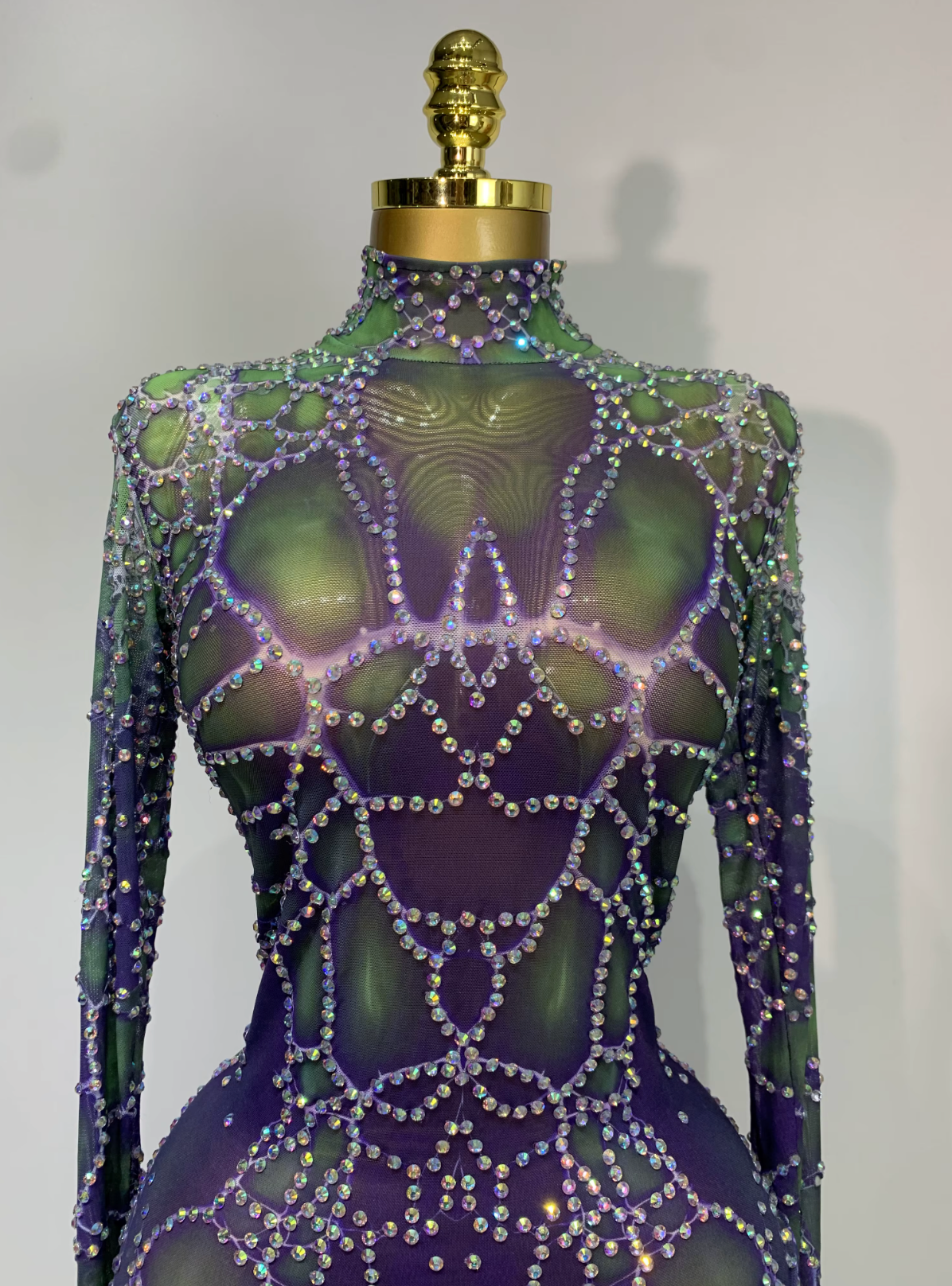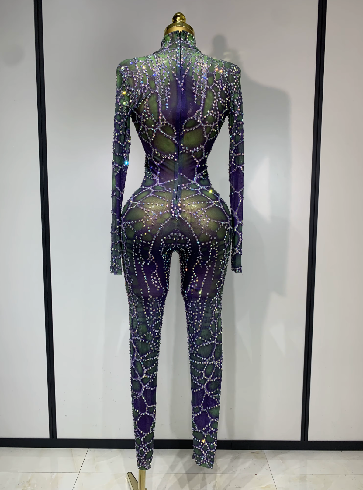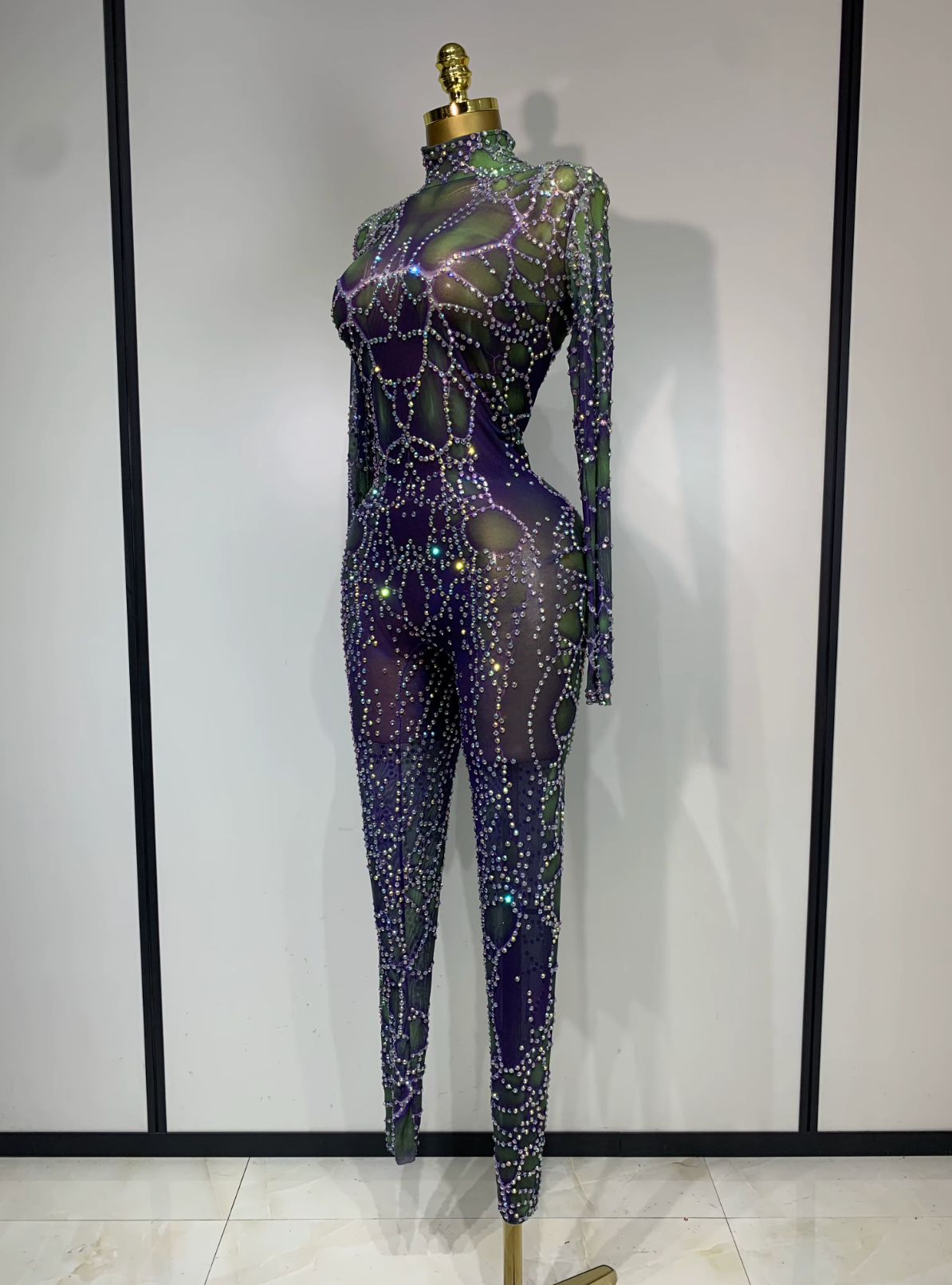 Step into radiant style with this shimmering festival and rave jumpsuit, designed to combine bold sparkle with elegant movement. Crafted to catch the light from every angle, this jumpsuit delivers a confident, show-stopping look for high-energy events and spotlight moments. Galaxy rhinestones jumpsuit.