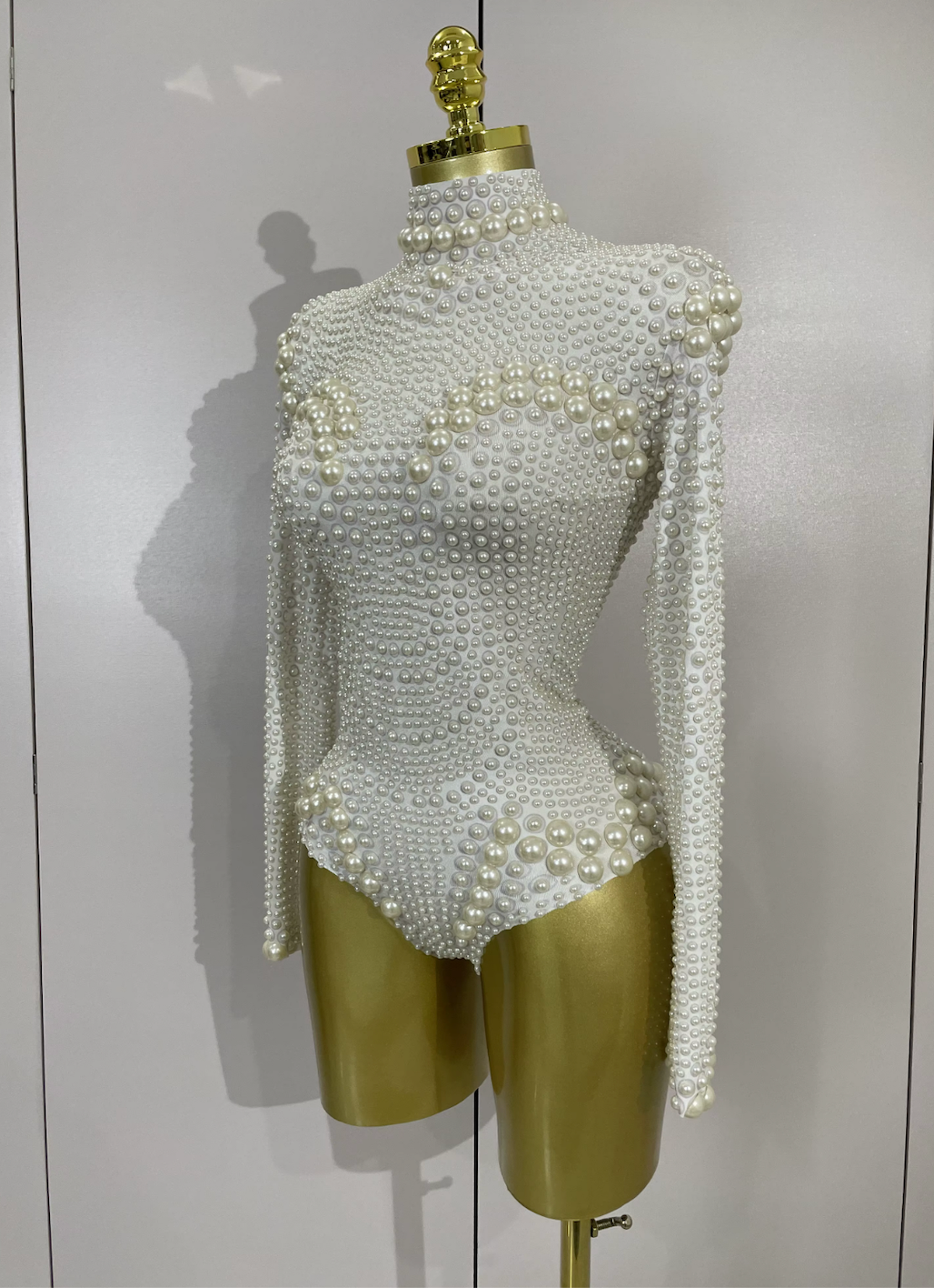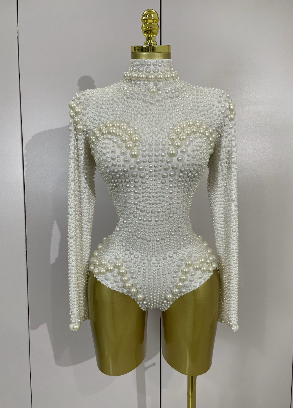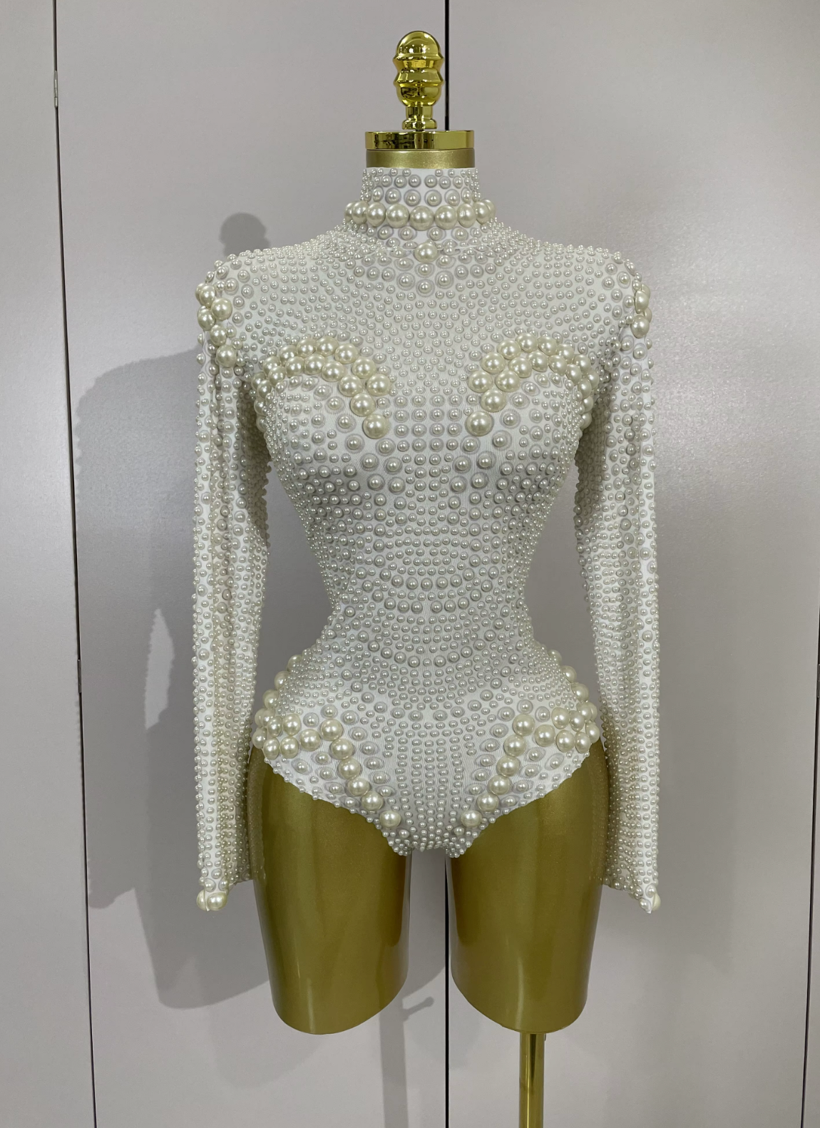 Make a breathtaking entrance in this white long sleeve embellished bodysuit with pearls, designed for bridal celebrations, luxury all-white parties, and high-impact stage performances. Featuring delicate pearl detailing and a sculpted silhouette, this statement piece blends elegance with show-ready glamour.