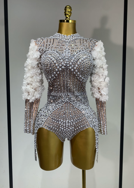 Luxury White Pearl Rhinestone Bridal Bodysuit | Sparkly Stage Jumpsuit