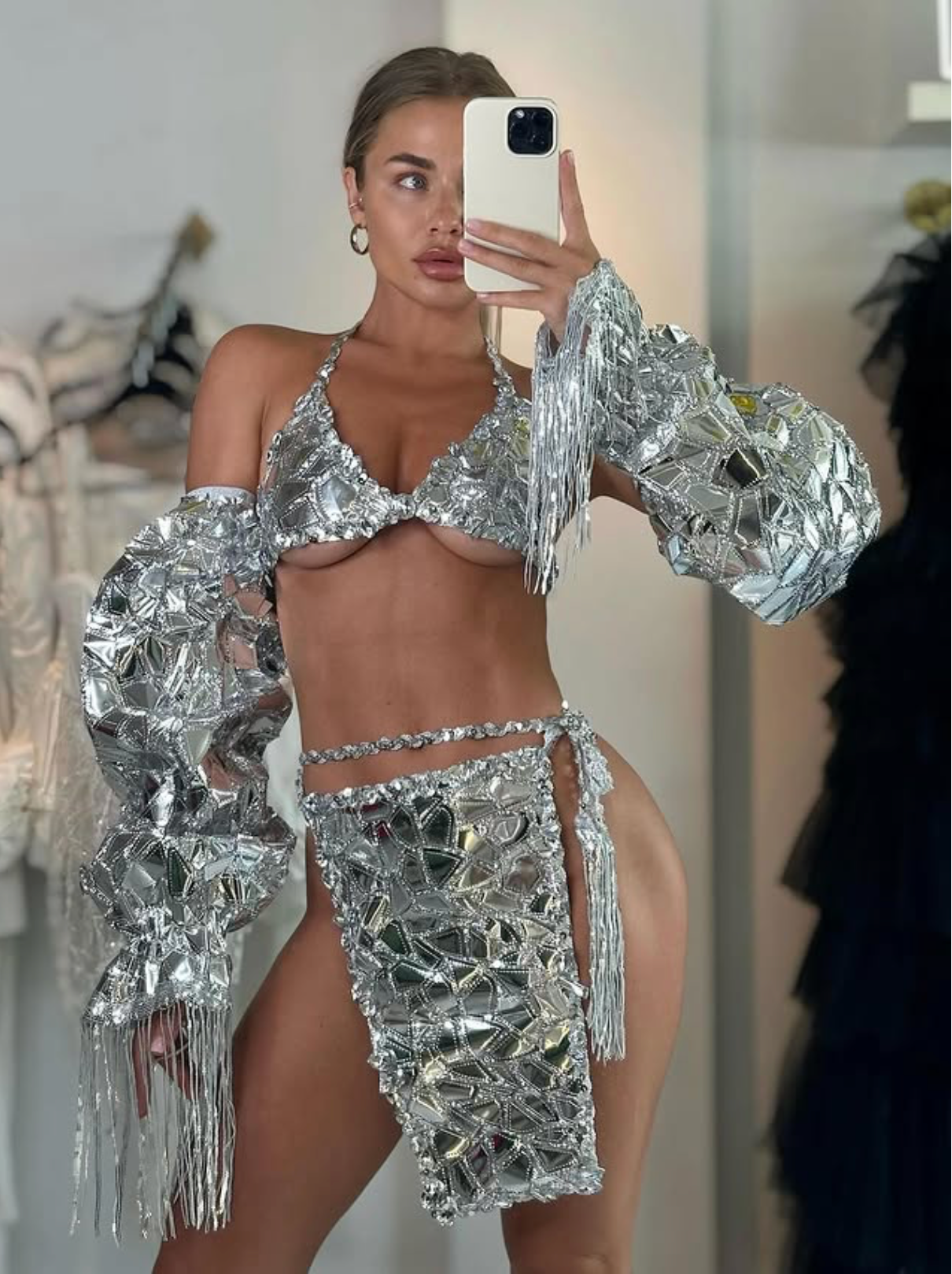 If you’re looking for a holographic nightclub outfit that combines shine, confidence, and modern design, this top and skirt set with body chain is a standout choice.