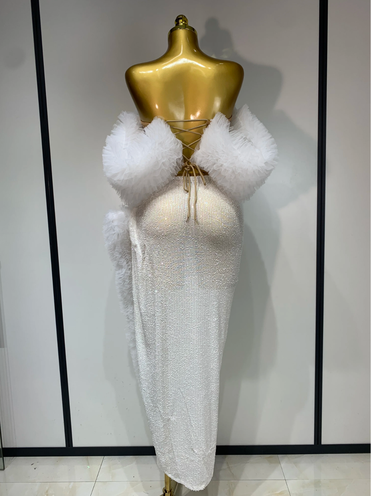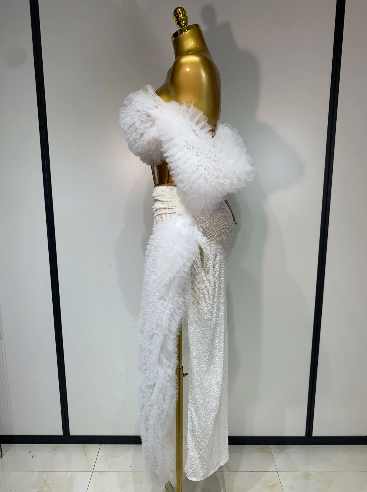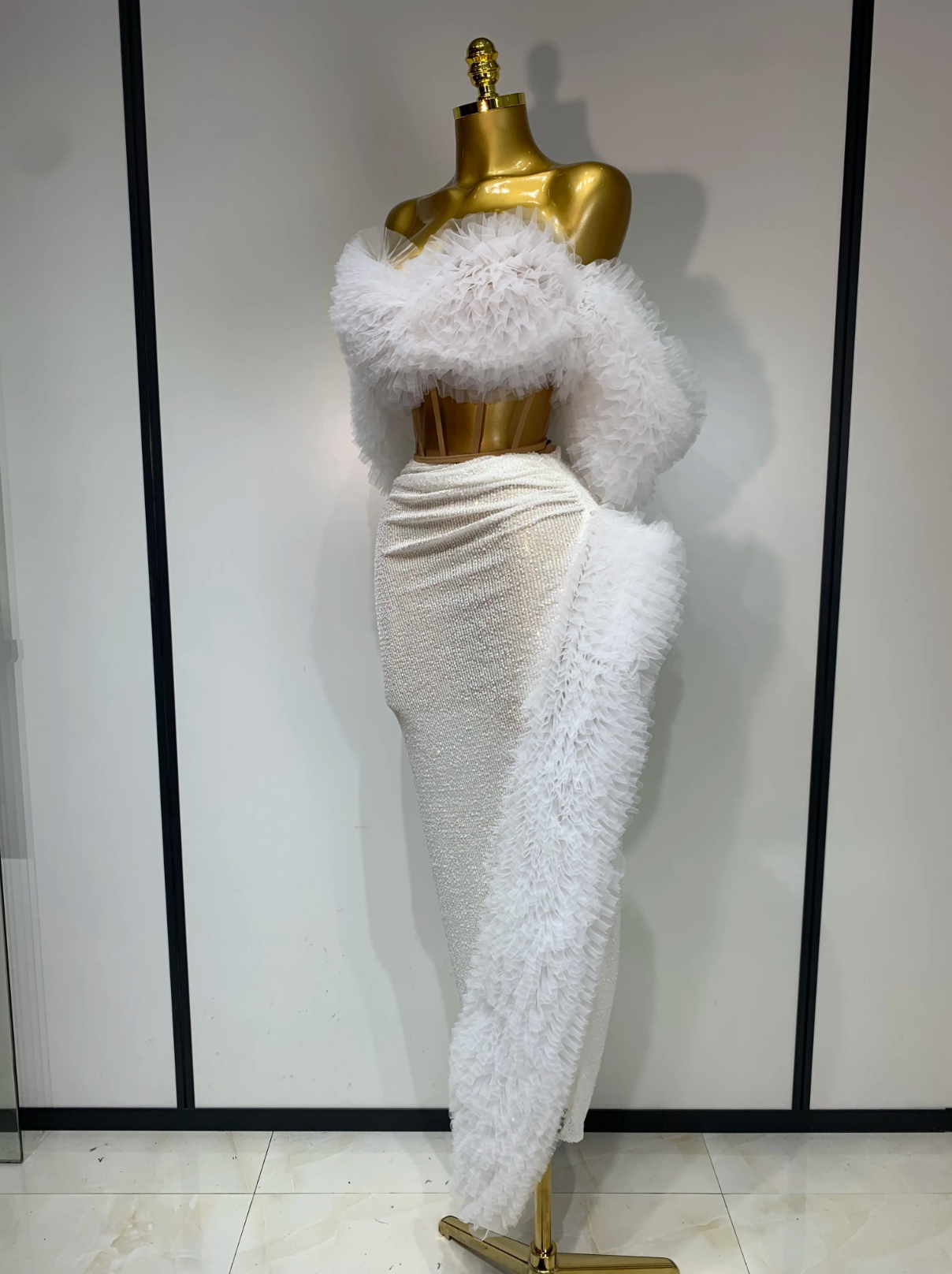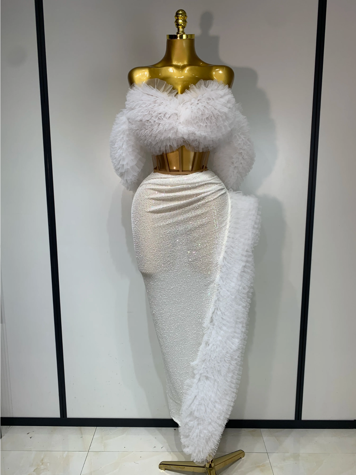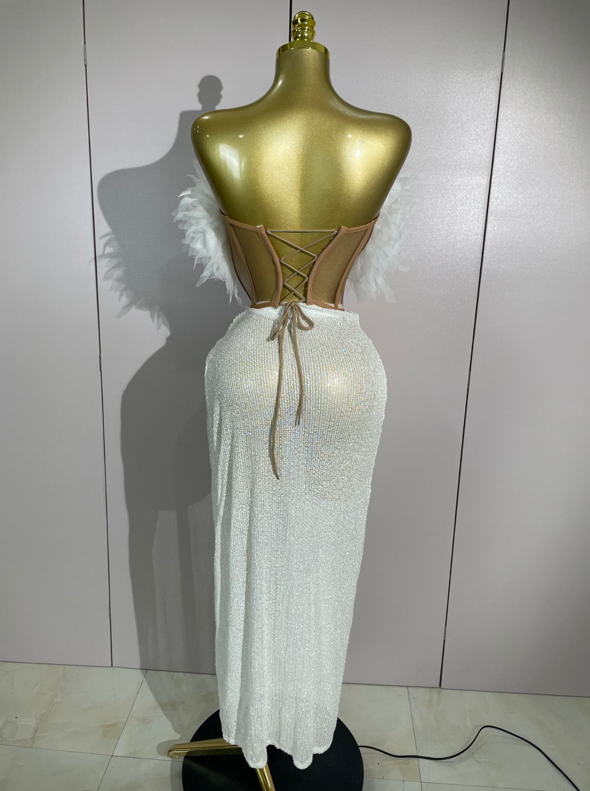 White Corset Two-Piece Evening Set – Elegant Glitter Top & Long Skirt Dress
