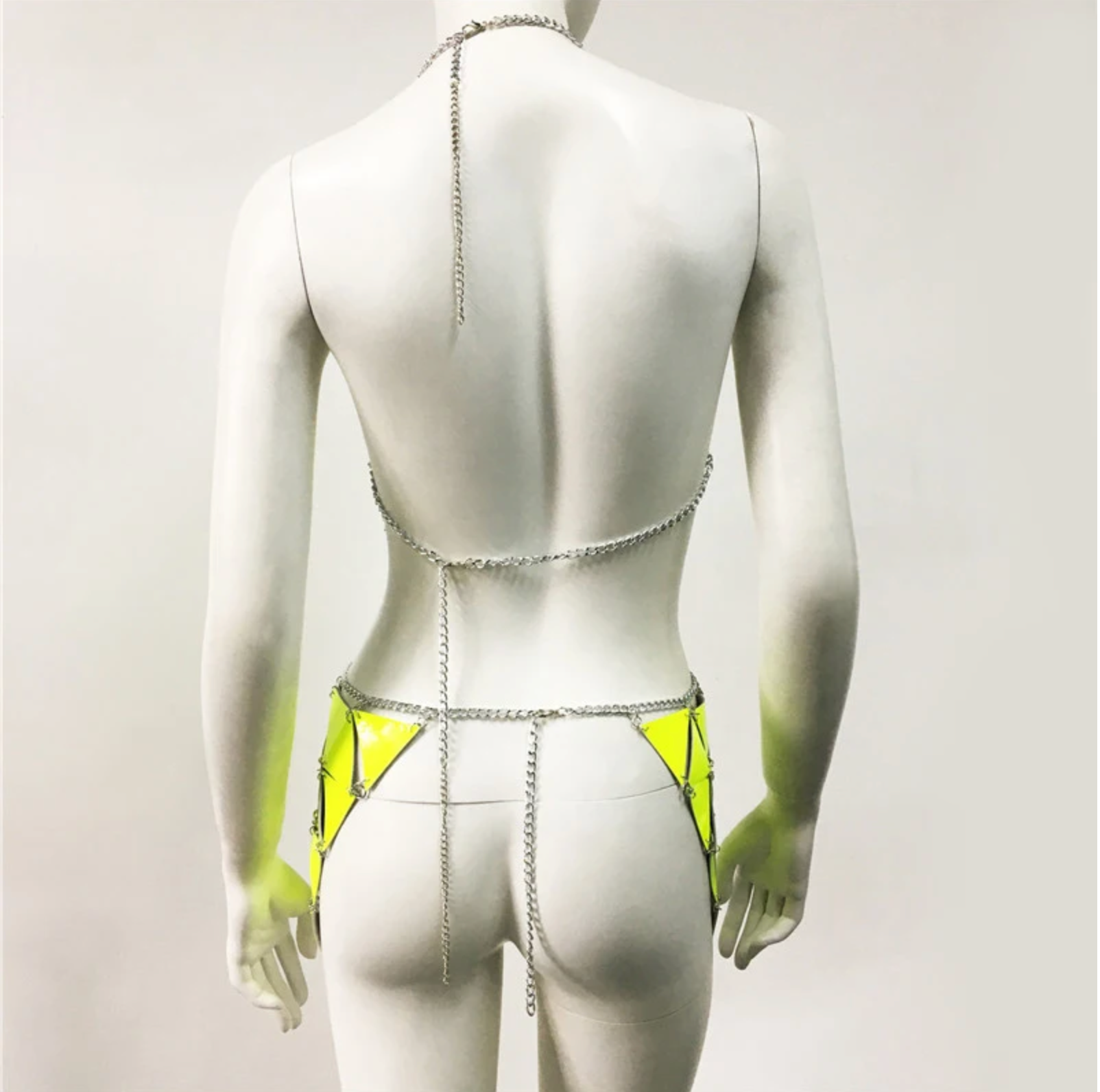 This neon yellow body chain set, designed to elevate your festival and party outfits with bold, eye-catching detail.