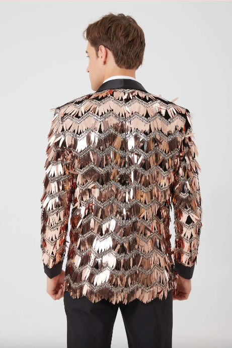 Goldglitzernder, verspiegelter Blazer mit Fransen, goldenes Party-Outfit für Herren, Jacke und Smoking, entworfen, um Ihren Charme zu unterstreichen. Herren-Outfit