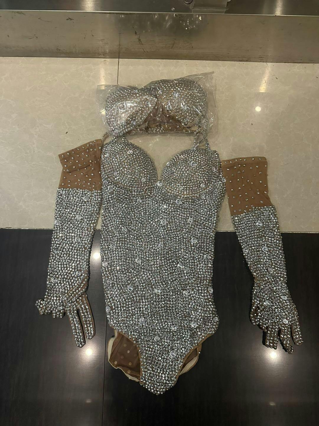 The sleek jumpsuit silhouette offers a sculpted fit while allowing freedom of movement—ideal for dancing, nightlife styling, and statement entrances. Whether worn for a night out, dance performance, or fashion-forward event, this crystal beaded jumpsuit blends luxury detail with confident, modern edge.
