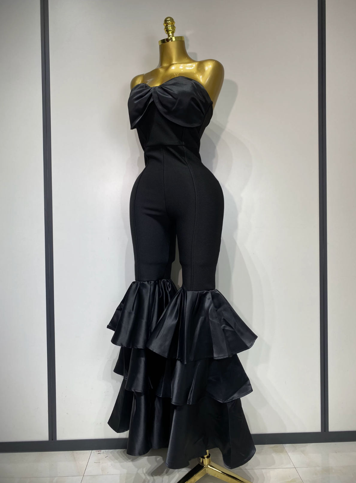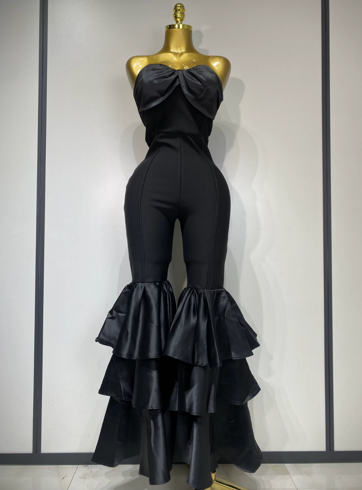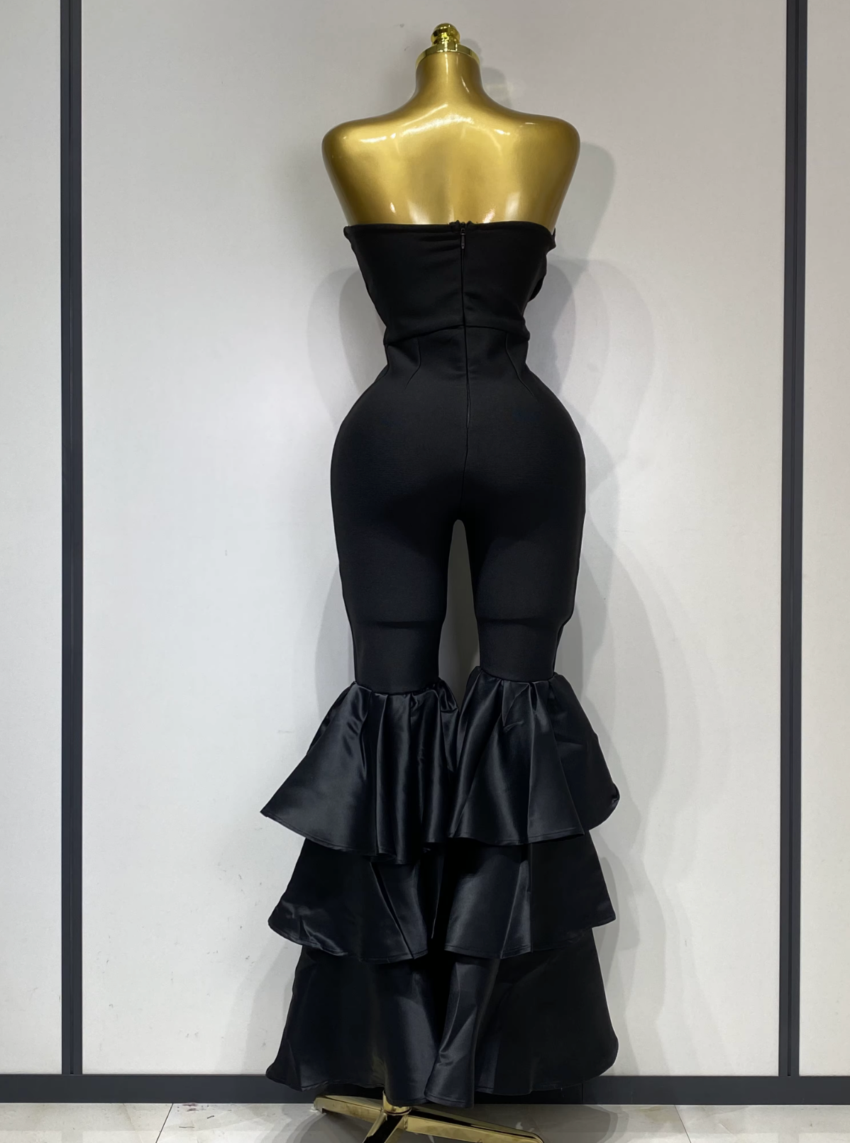 Black Strapless Ruffle Romper | Luxury Bandage Bodysuit Birthday Jumpsuit