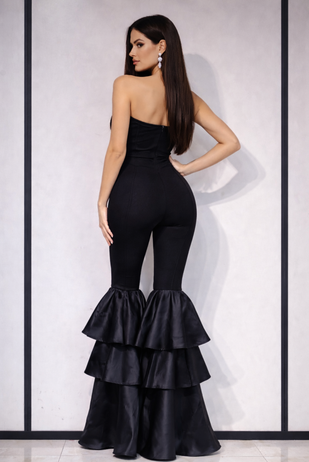 Bold, sculpted, and celebration-ready, this Black Strapless Ruffle Birthday Romper is designed to make a powerful style statement. Featuring a structured bandage-style bodysuit fit, dramatic ruffle detailing, and a flattering flare-leg jumpsuit silhouette, this piece blends luxury fashion with confident attitude.