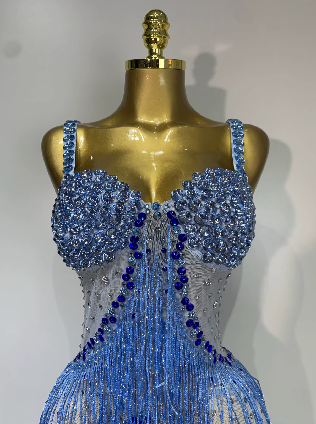 The crystal-embellished fringe moves beautifully with every step, making it ideal for performances, red-carpet moments, galas, and upscale parties. Crafted for comfort and elegance, this blue maxi gown delivers a flattering silhouette while catching the light effortlessly.