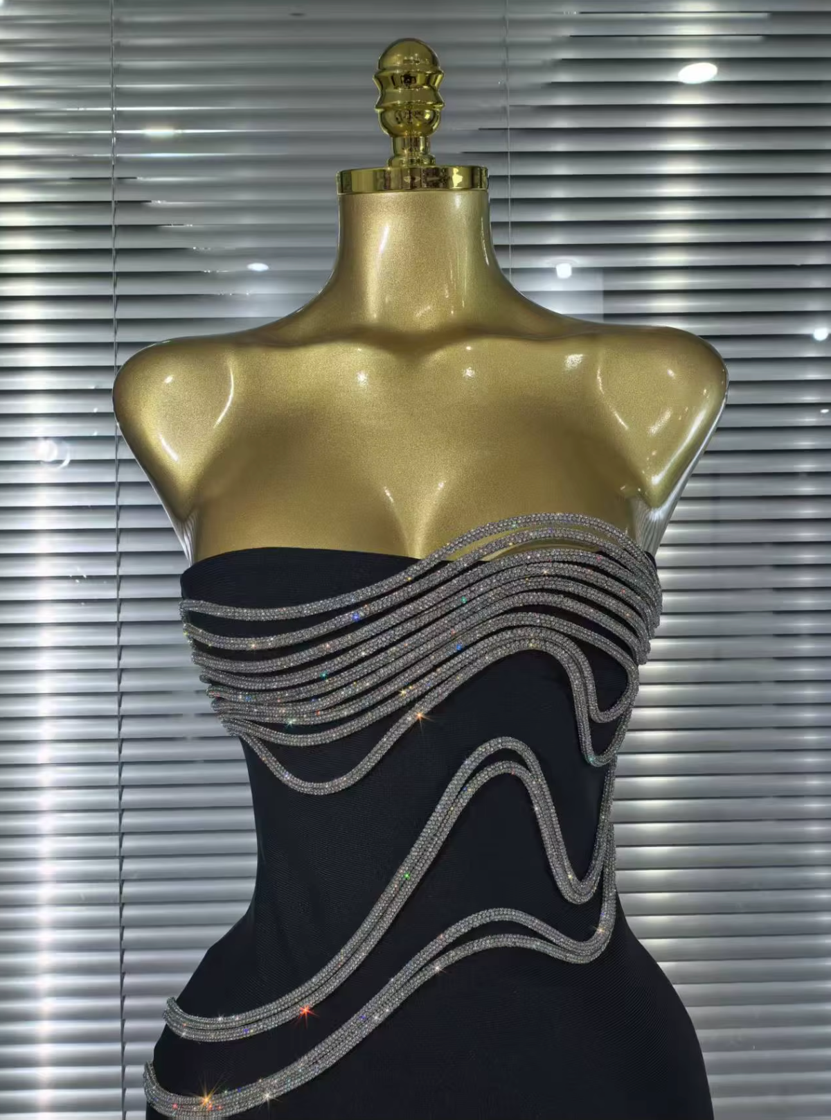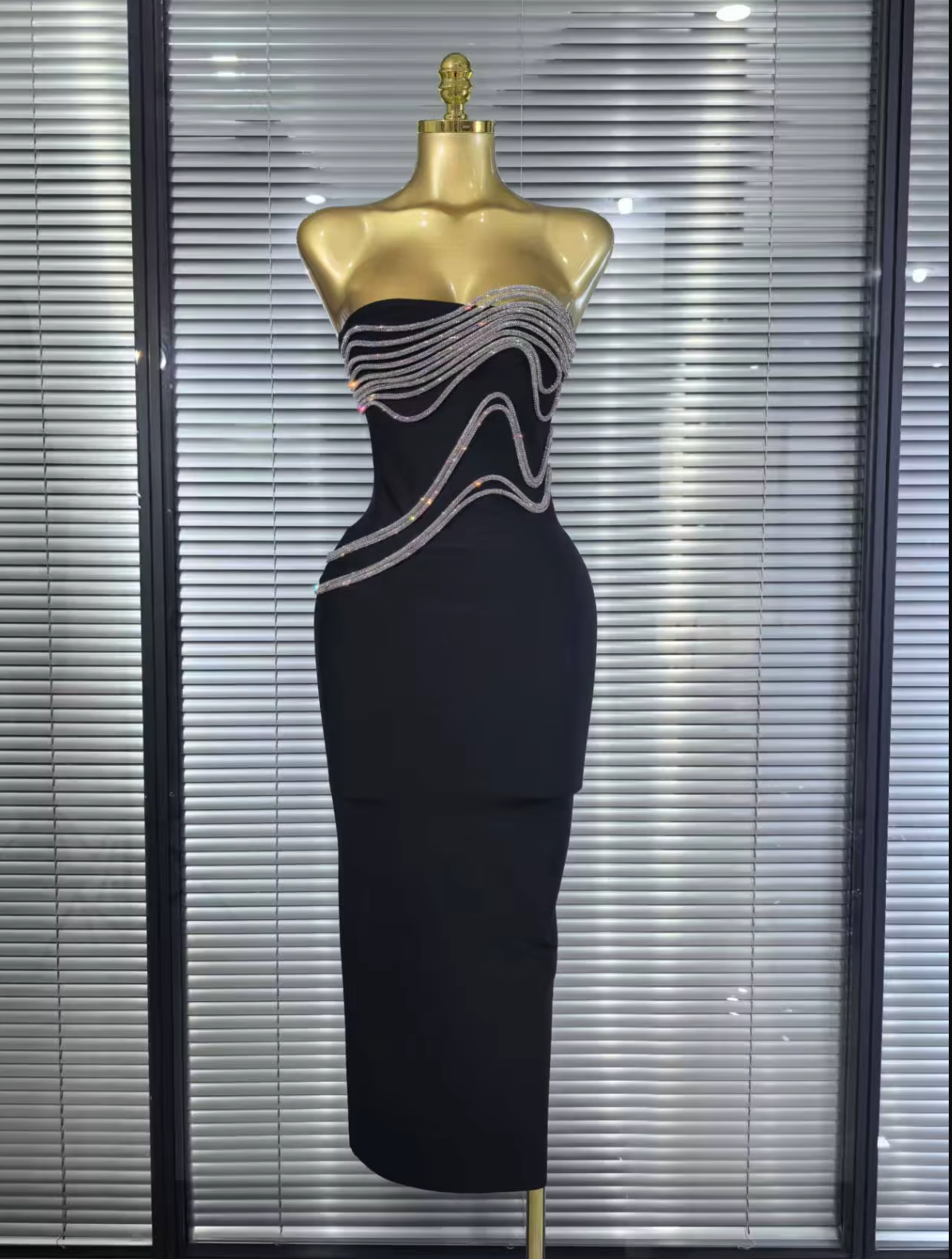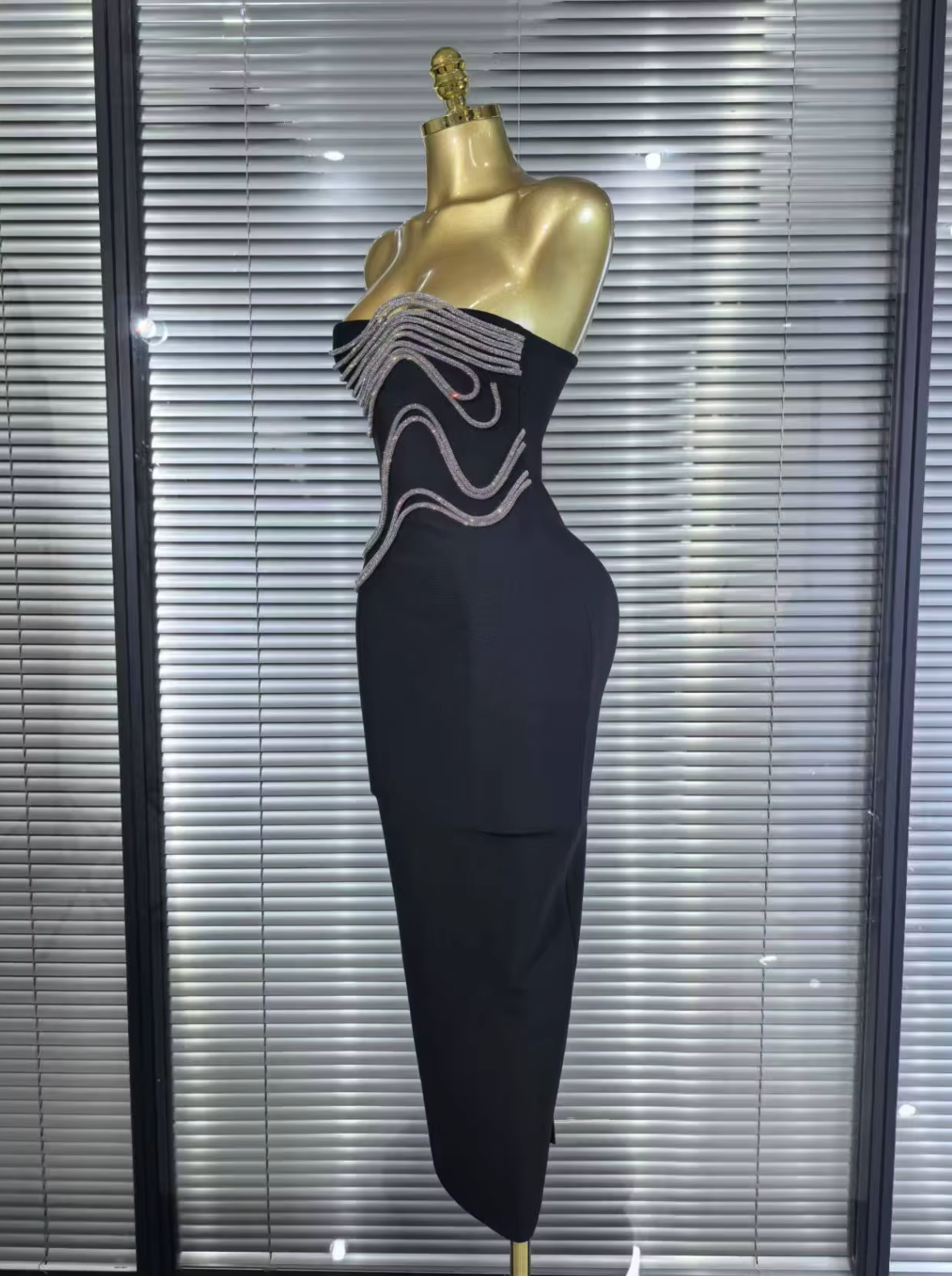 The timeless black color paired with radiant crystal embellishments makes this dress ideal for formal parties, special occasions, and upscale nightlife. Whether you’re attending a birthday event, celebrating at a cocktail party, or stepping out for an elegant evening gathering, this black party dress is designed to stand out under lights and cameras.