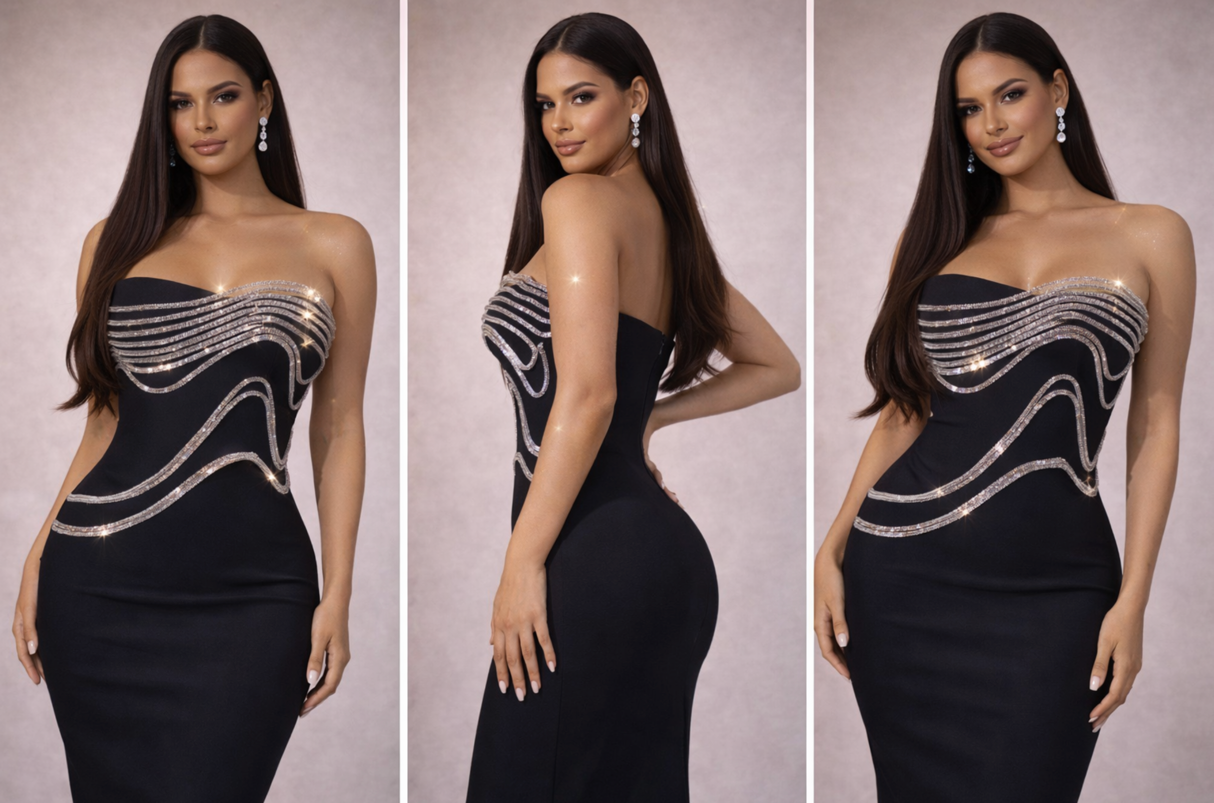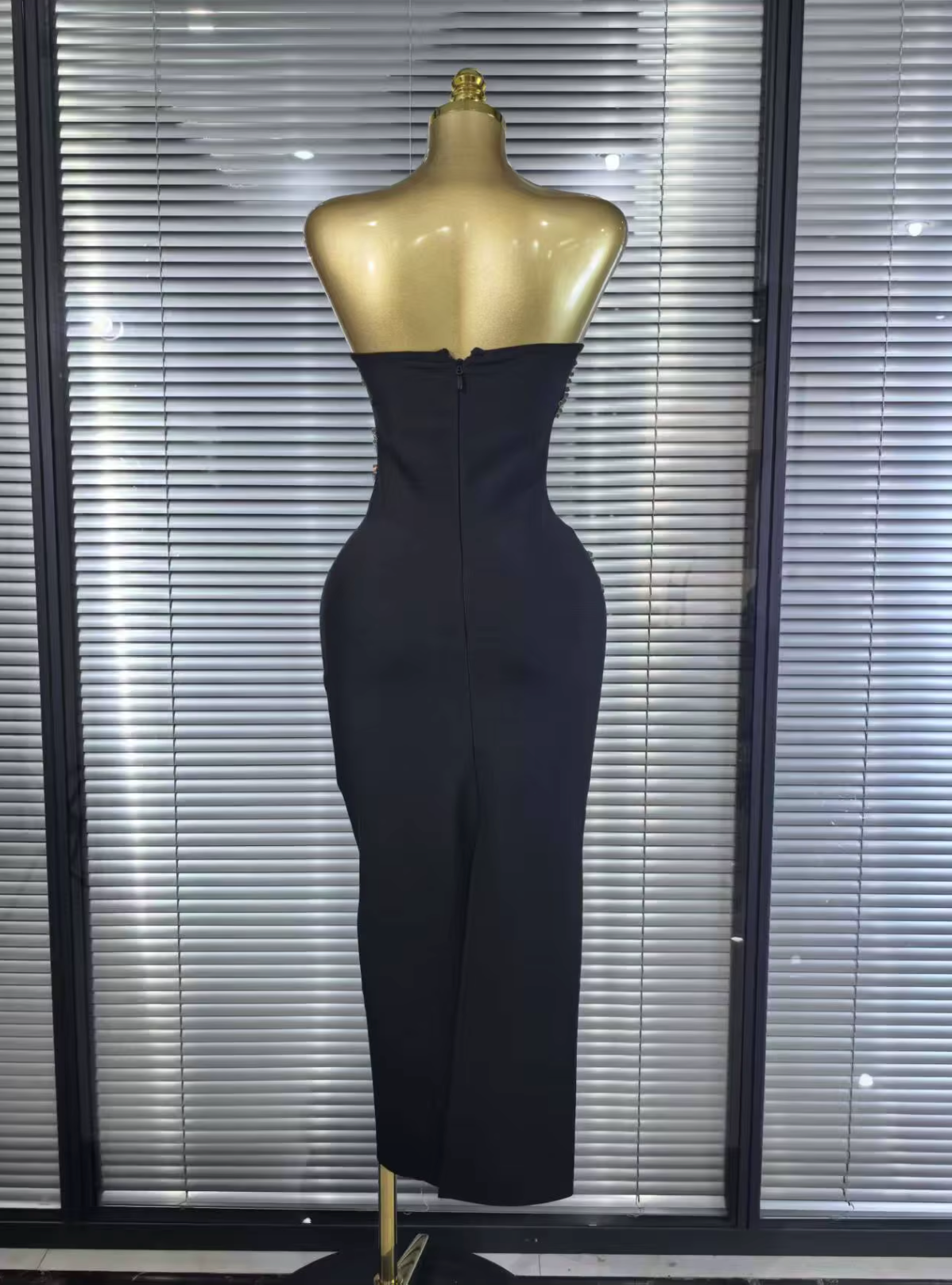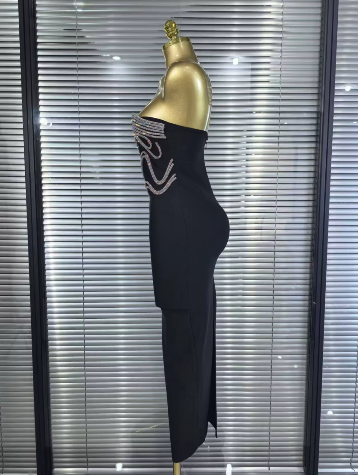 The timeless black color paired with radiant crystal embellishments makes this dress ideal for formal parties, special occasions, and upscale nightlife. Whether you’re attending a birthday event, celebrating at a cocktail party, or stepping out for an elegant evening gathering, this black party dress is designed to stand out under lights and cameras.