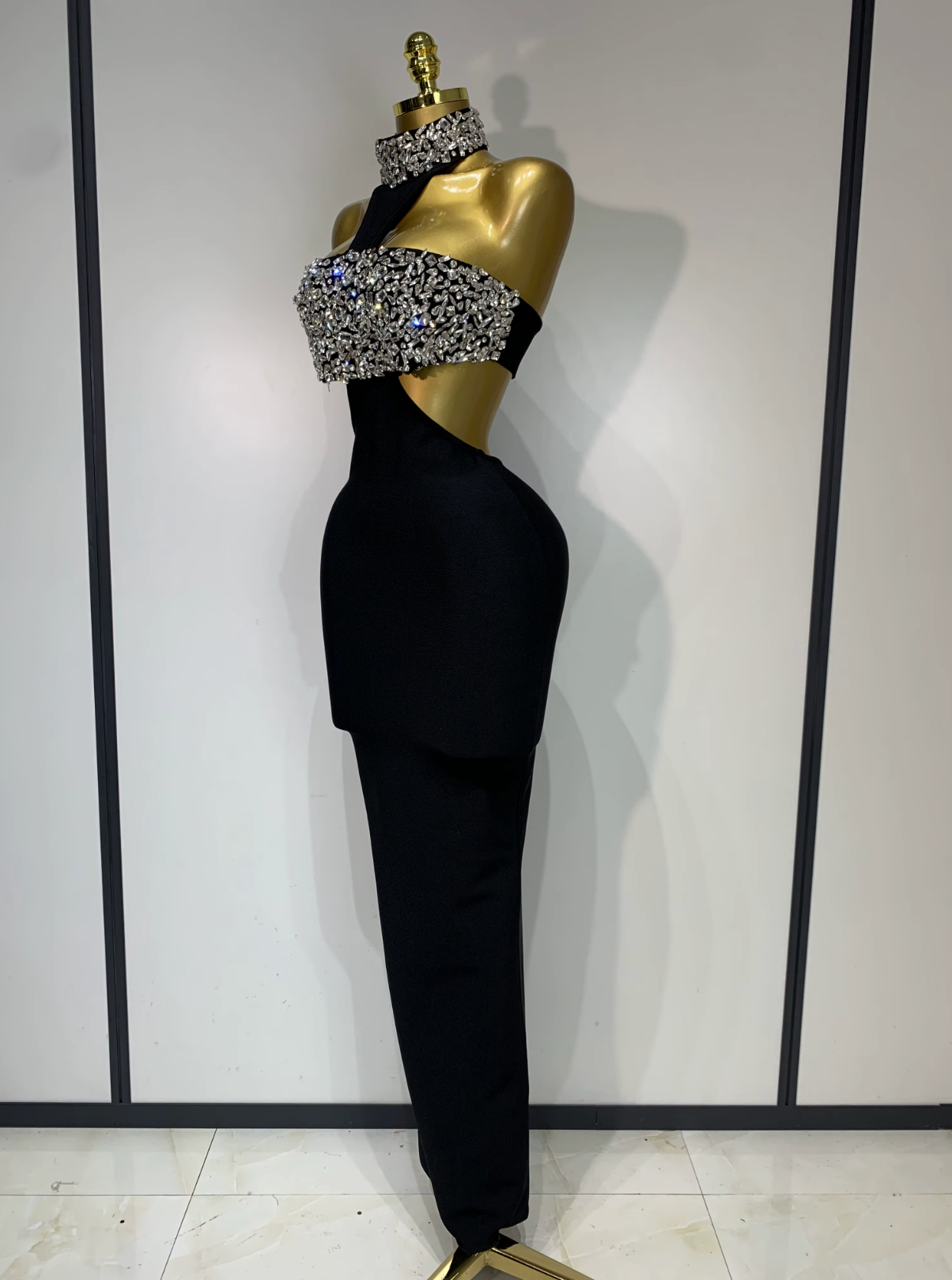 Make an unforgettable entrance in this Rhinestone Choker Evening Gown, designed with timeless red-carpet glamour in mind. Featuring a sleek choker neckline adorned with rhinestones and a flowing maxi-length silhouette, this gown delivers elegance, confidence, and luxury shine.
