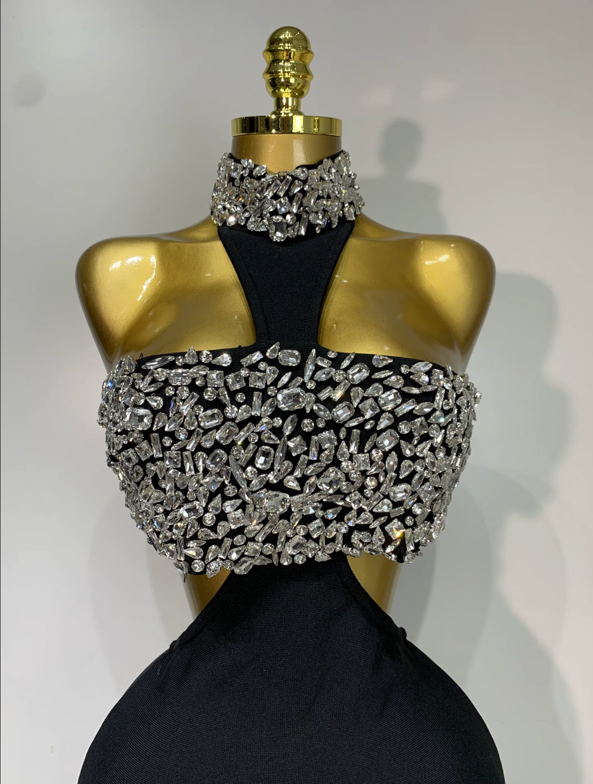 • Rhinestone choker neckline for dramatic elegance