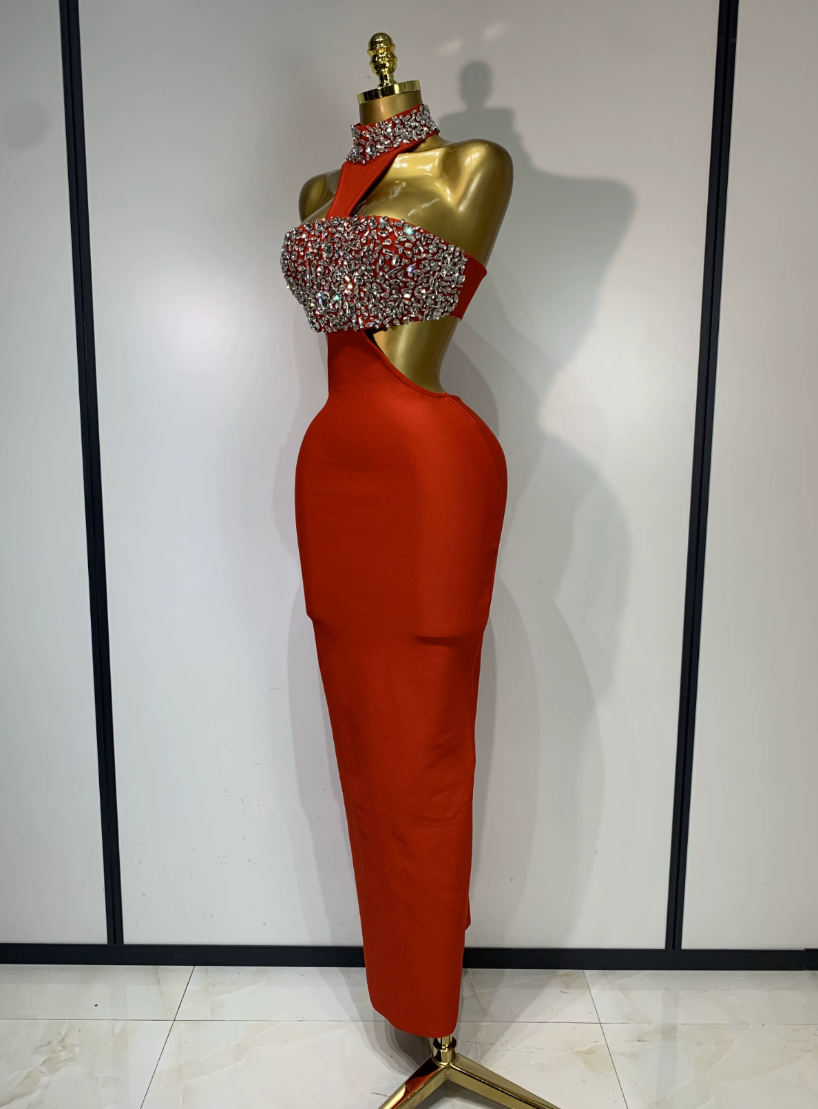 The rhinestone detailing catches the light beautifully while the elongated design creates a statuesque, refined look. Perfect for formal events, galas, evening celebrations, and upscale occasions, this red carpet inspired maxi gown is made for women who want to look powerful and polished.