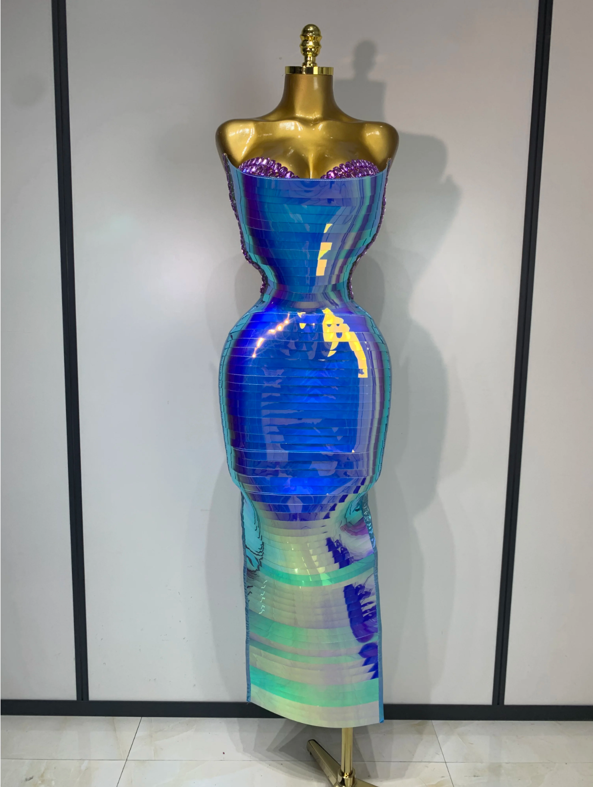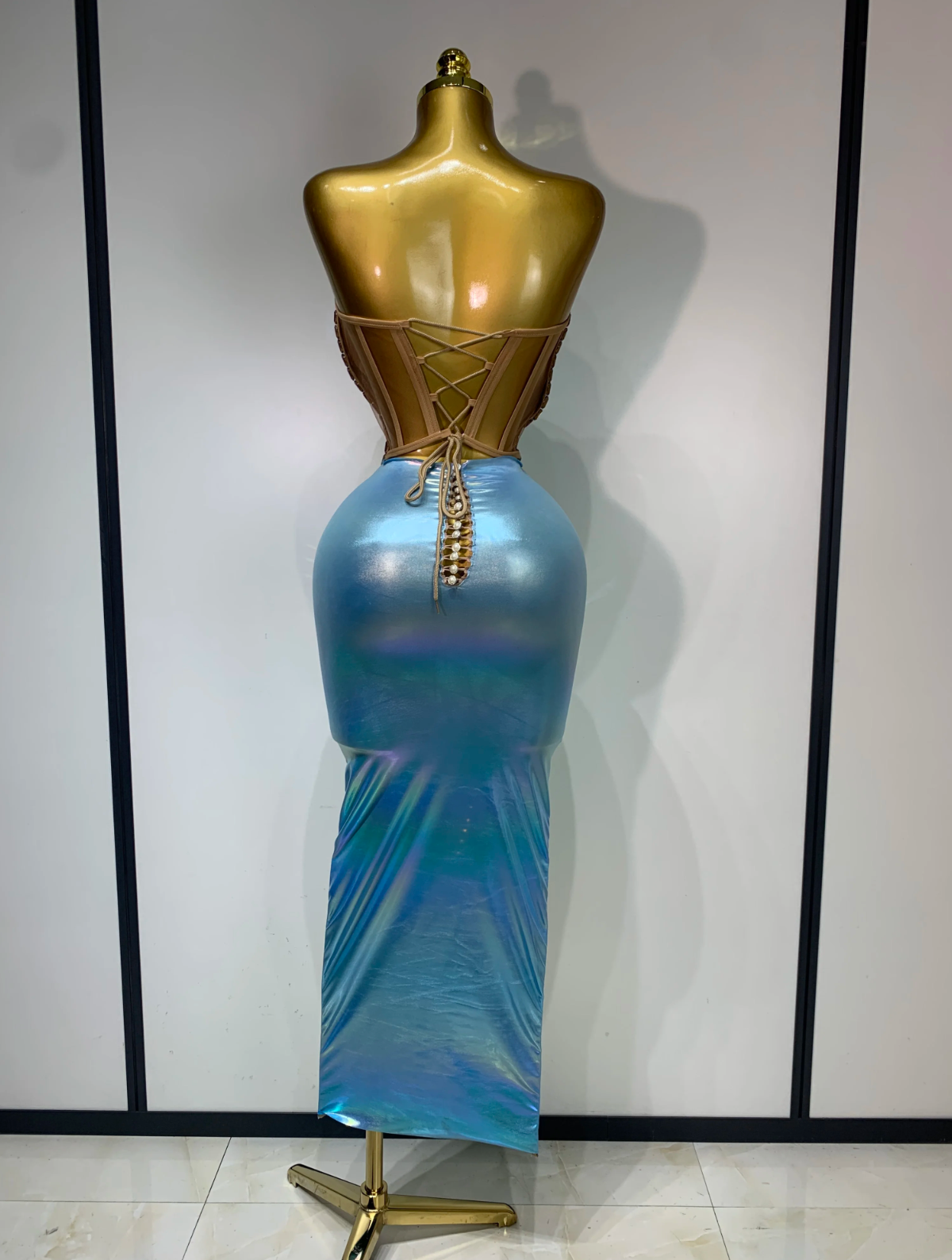 Luxury Blue Sequin Strapless Bodycon Metallic Dress