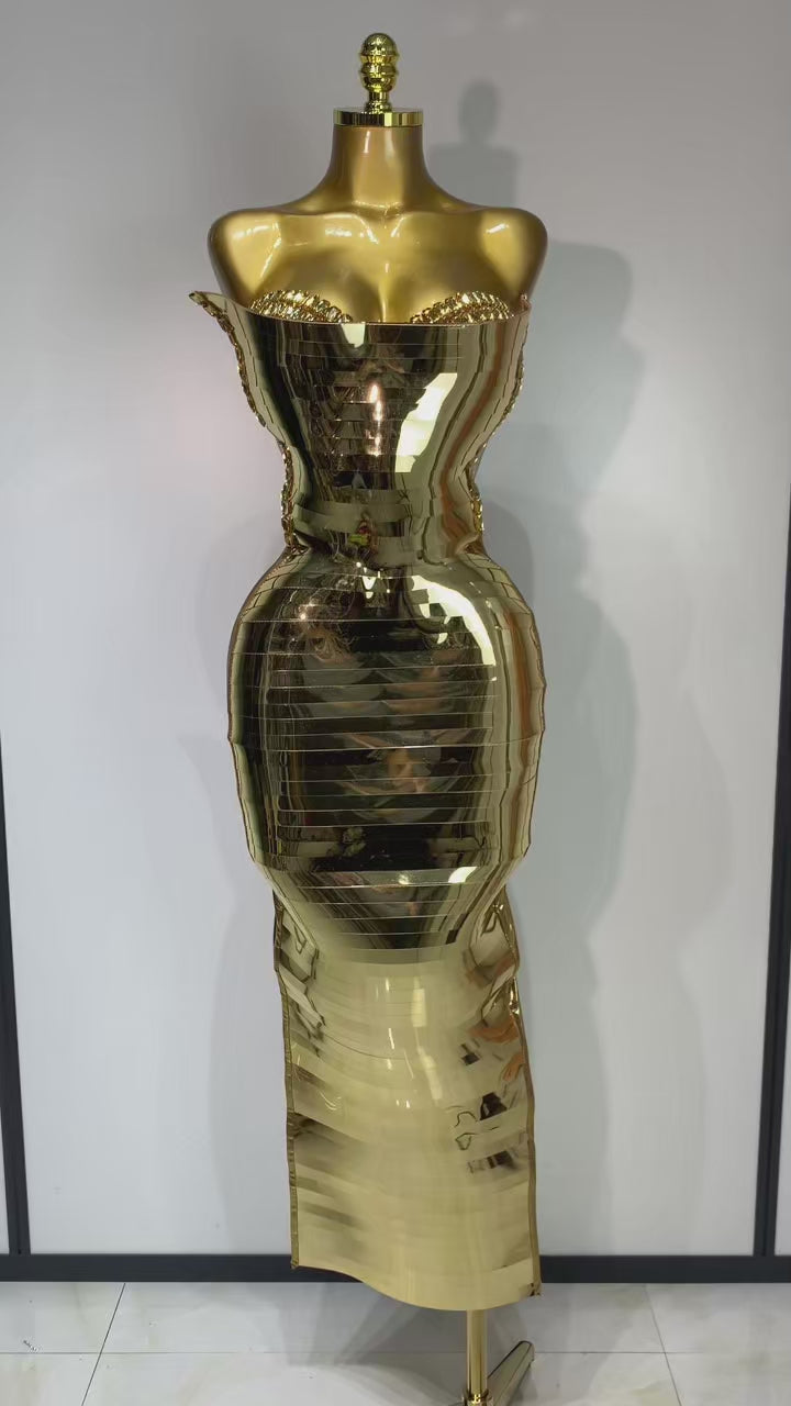 Step into the spotlight with this luxury gold sequin strapless bodycon dress, designed to deliver a bold, high-glam look inspired by Y2K fashion and celebrity style. Covered in shimmering gold sequins with crystal accents, this one-piece dress is made to catch the light and command attention.