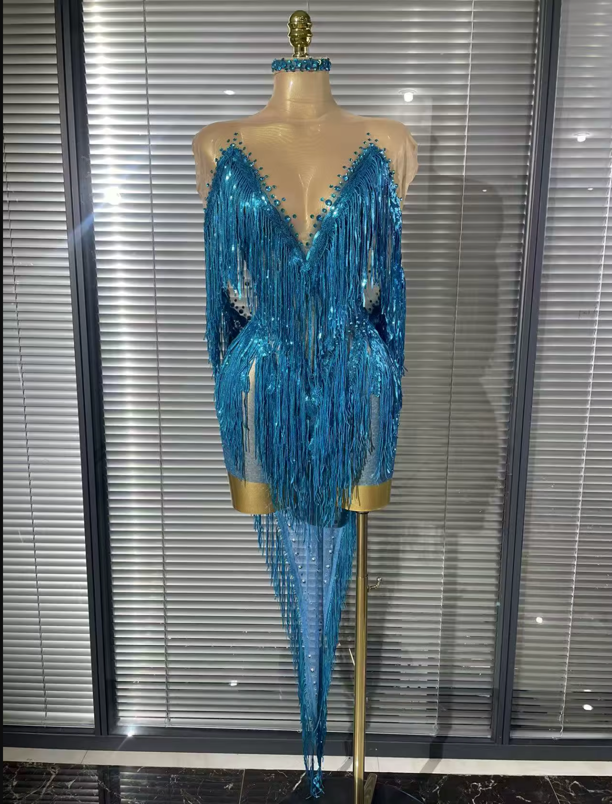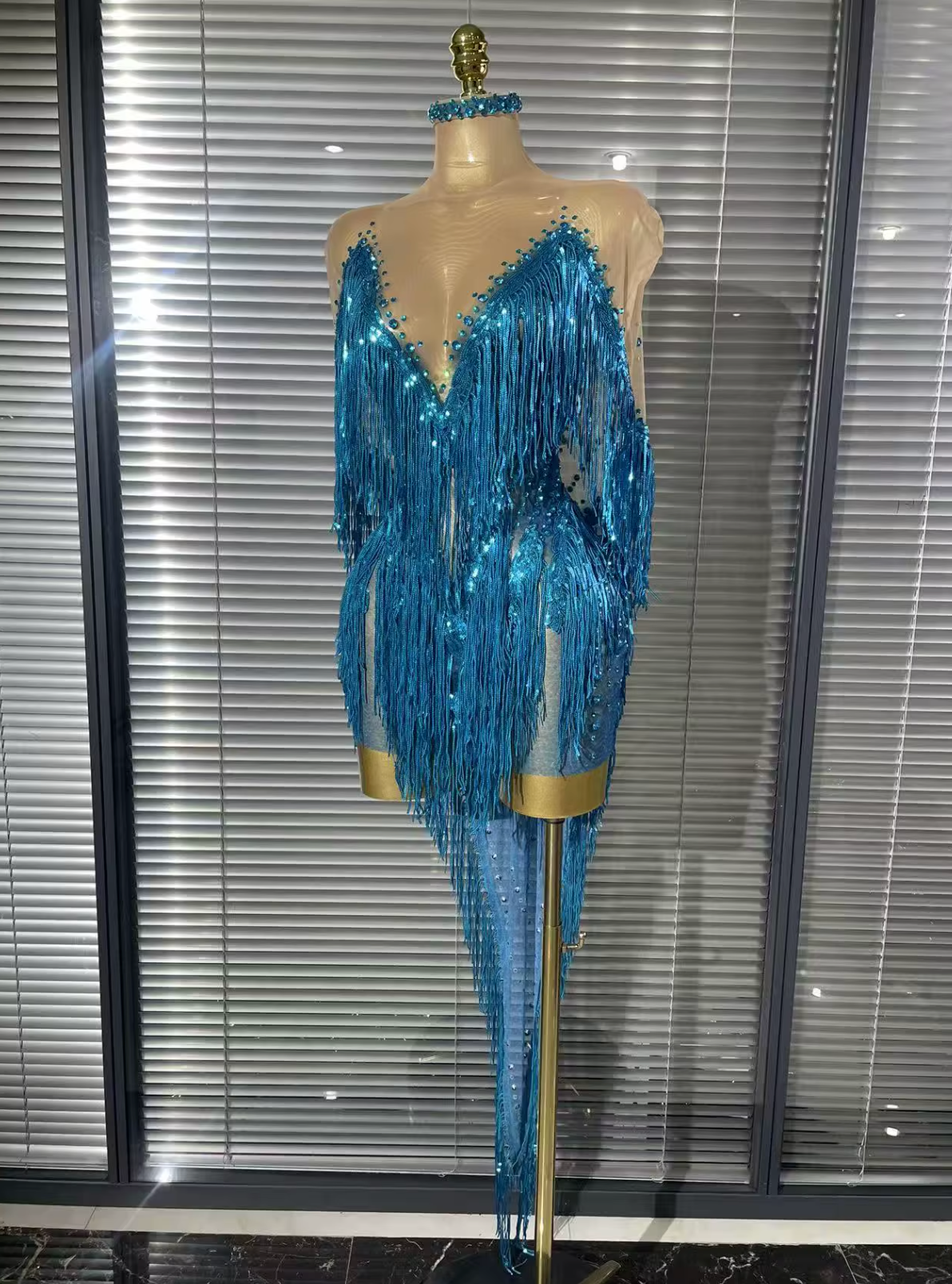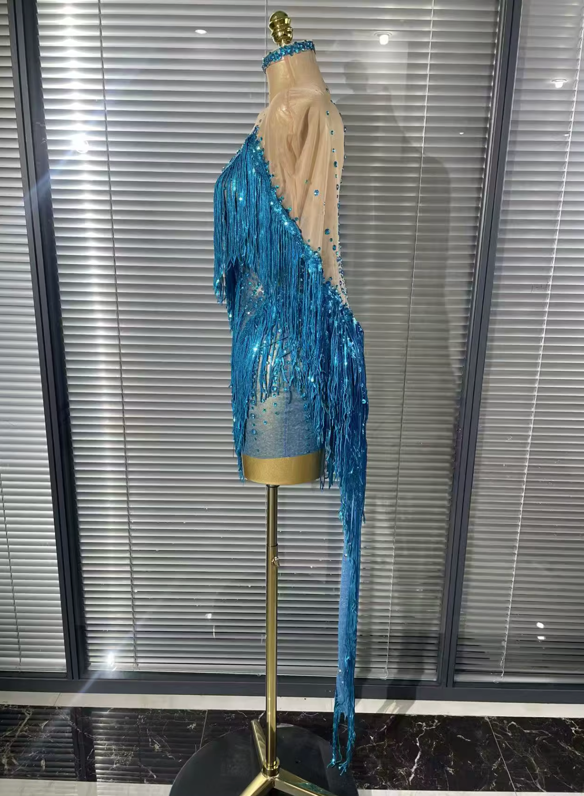 Elevate your look with this statement turquoise fringe mini dress designed to move with you. Crafted with shimmering sequins, intricate beadwork, and a flattering illusion V-neckline, this luxury party dress delivers glamour from every angle. The asymmetric fringe sleeve and sculpted silhouette make it perfect for birthdays, cocktail parties, bachelorette events, and nights out. Designed for confidence, movement, and unforgettable entrances.  Burlesque themed dance with the stars costume.