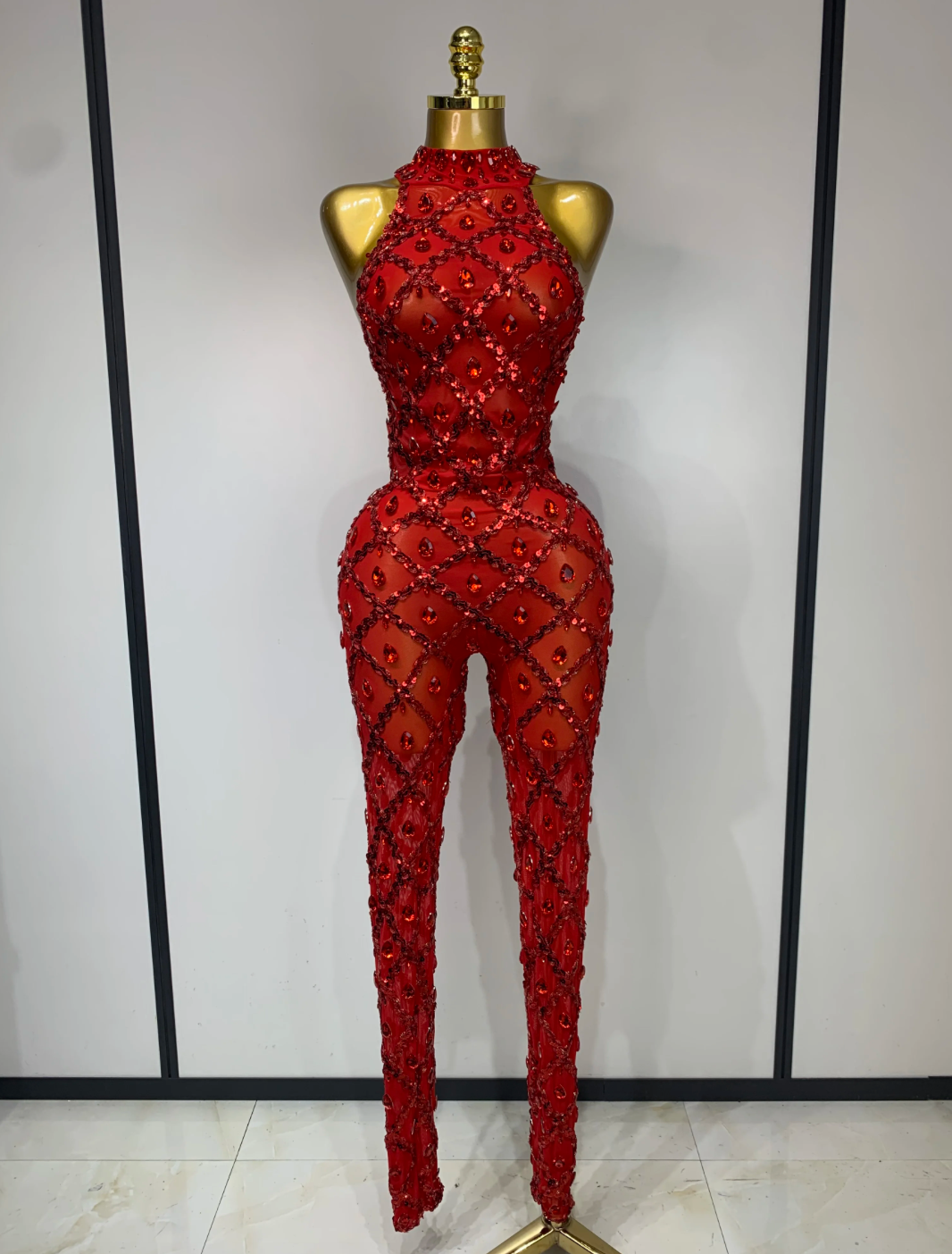 Luxury Rhinestone Mesh Jumpsuit – See-Through Backless Bodysuit Catsuit Party Outfit