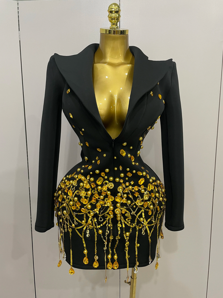 Make a bold luxury statement in this gold crystal chain and pearl long sleeve mini dress, available in elegant black and pink. Designed to sparkle under lights, this embellished mini dress features draped gold crystal chains and pearl accents that elevate your look for upscale parties, birthday celebrations, and evening events.