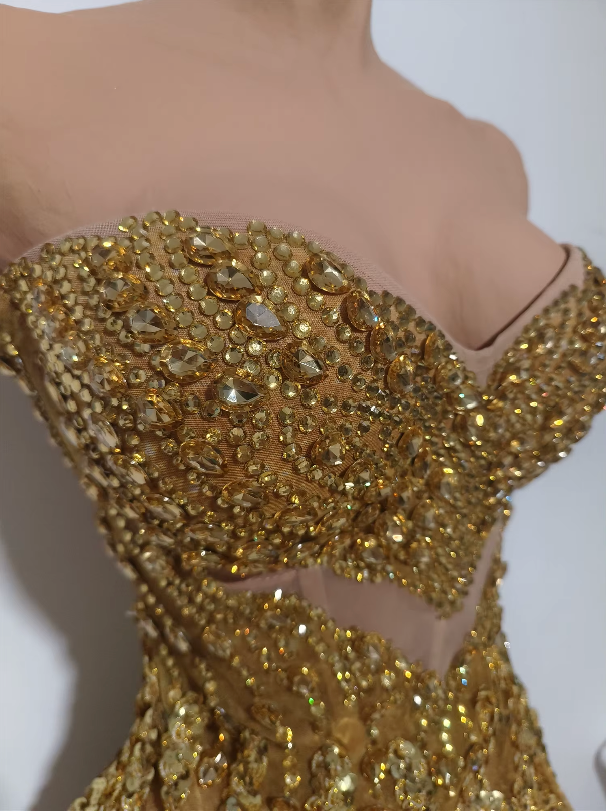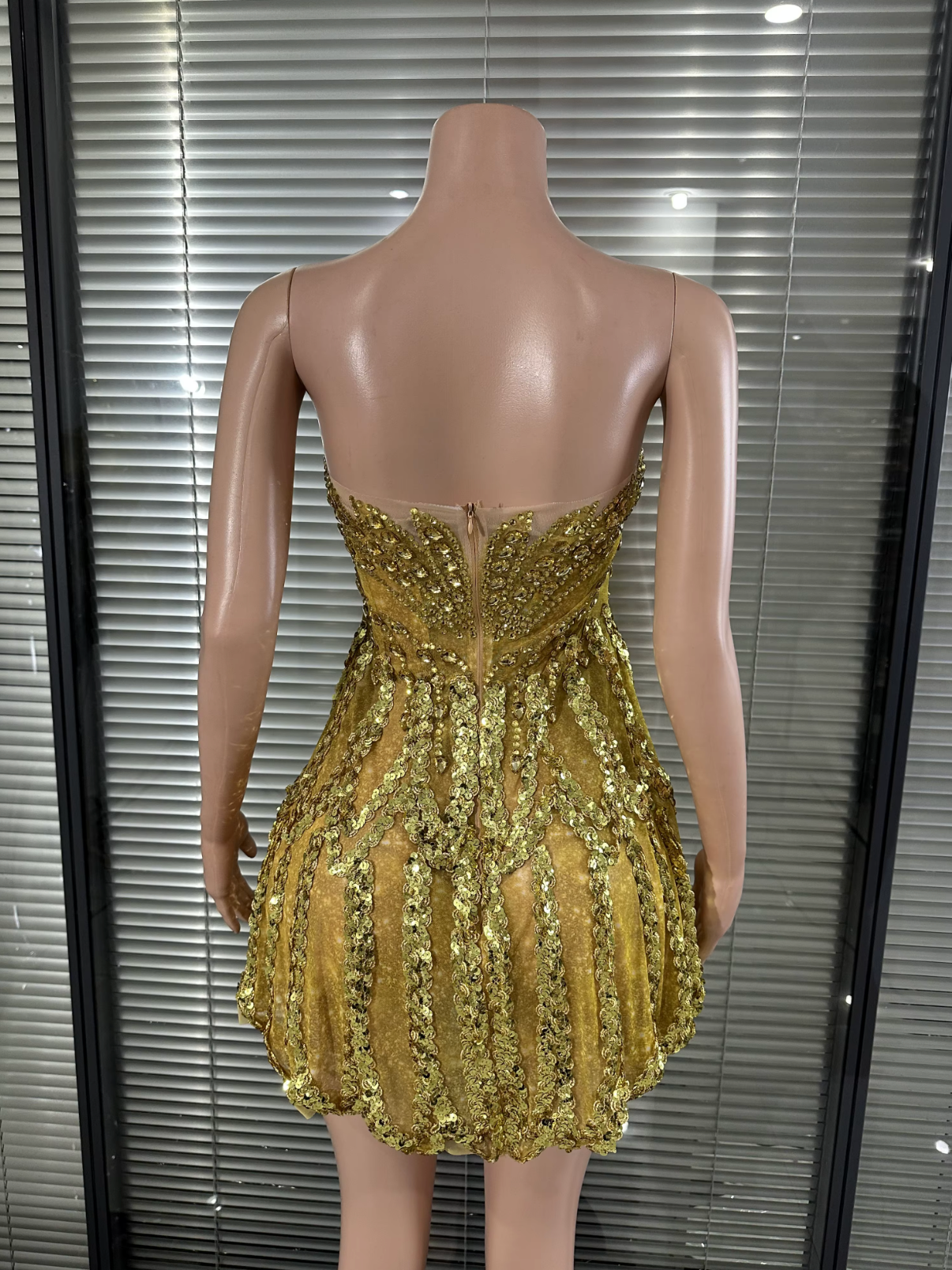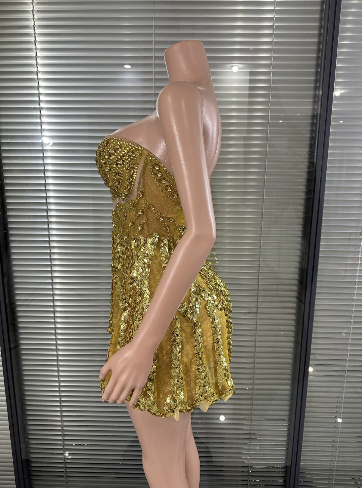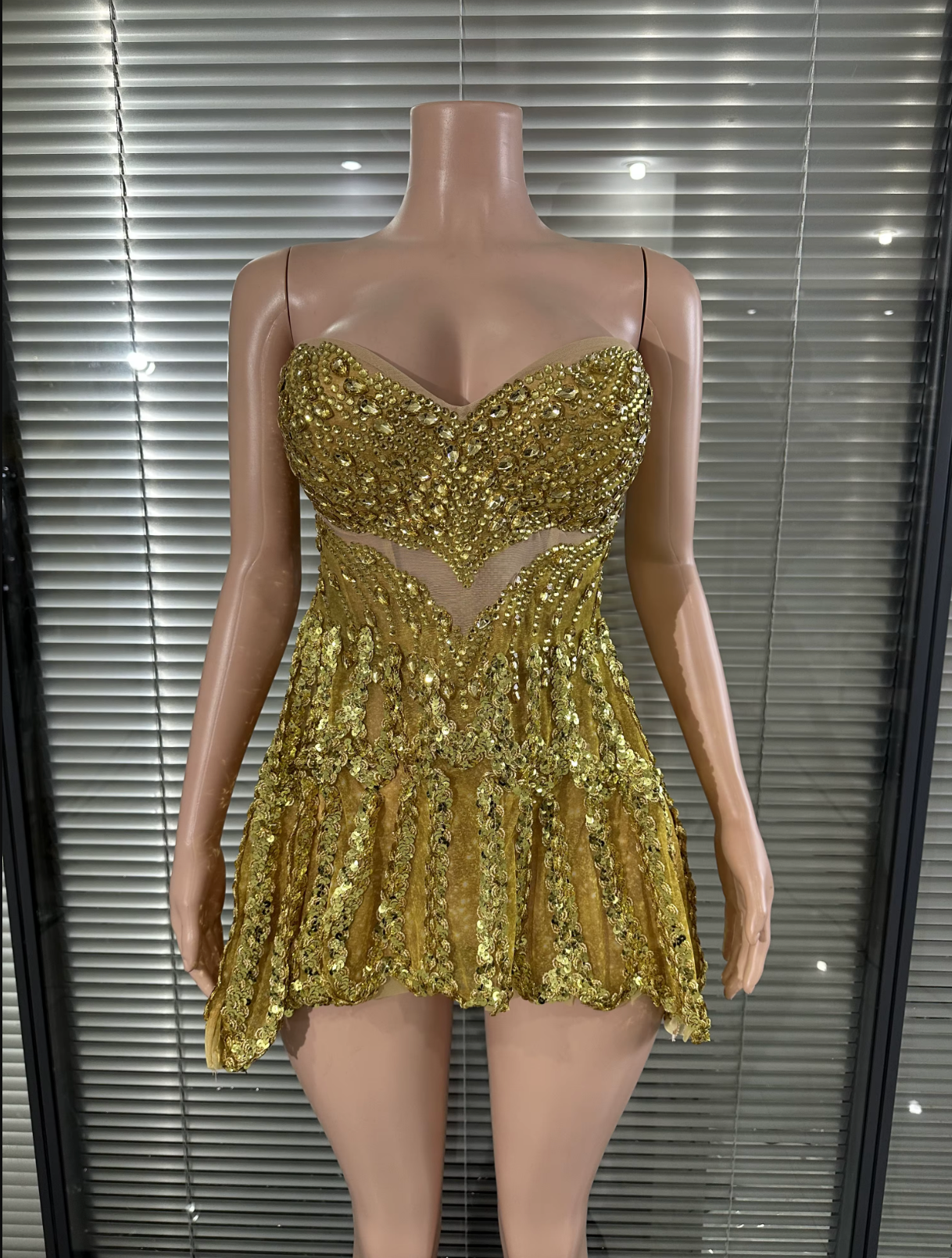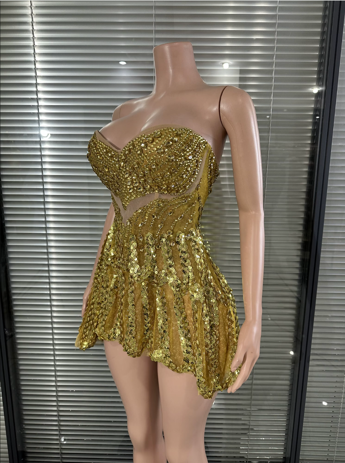 Luxurious gold sequin mini dress with sparkling diamond details. Perfect for birthdays, stage performances, singers, and nightclub parties.