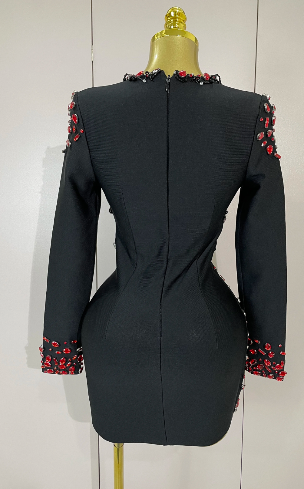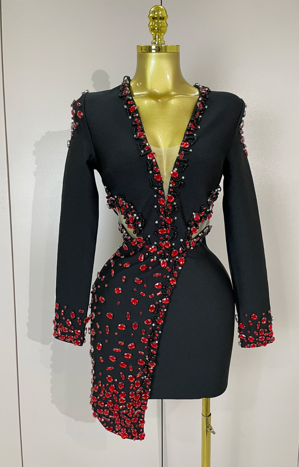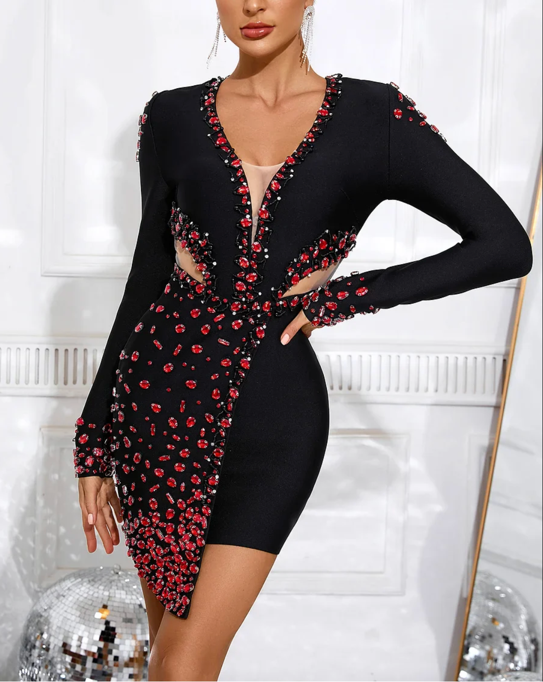 Celebrity-inspired black bandage mini dress with V-neck, long sleeves, and rhinestone beading. Perfect for evening parties and club nights.