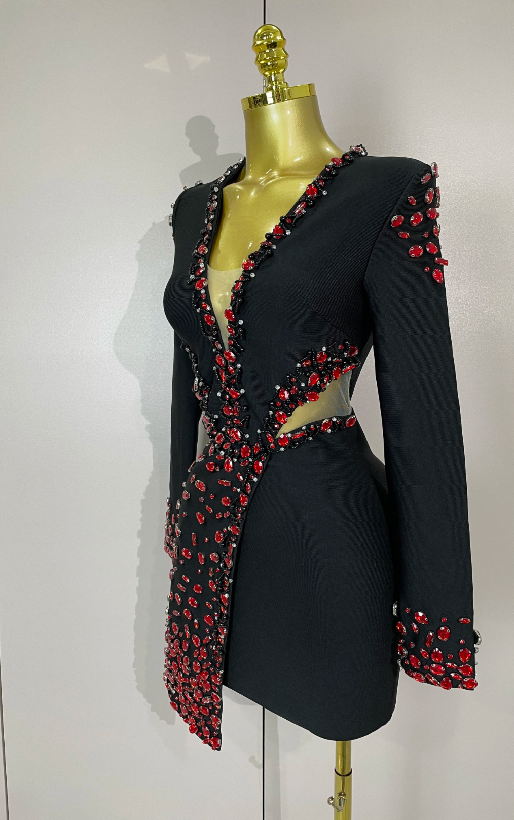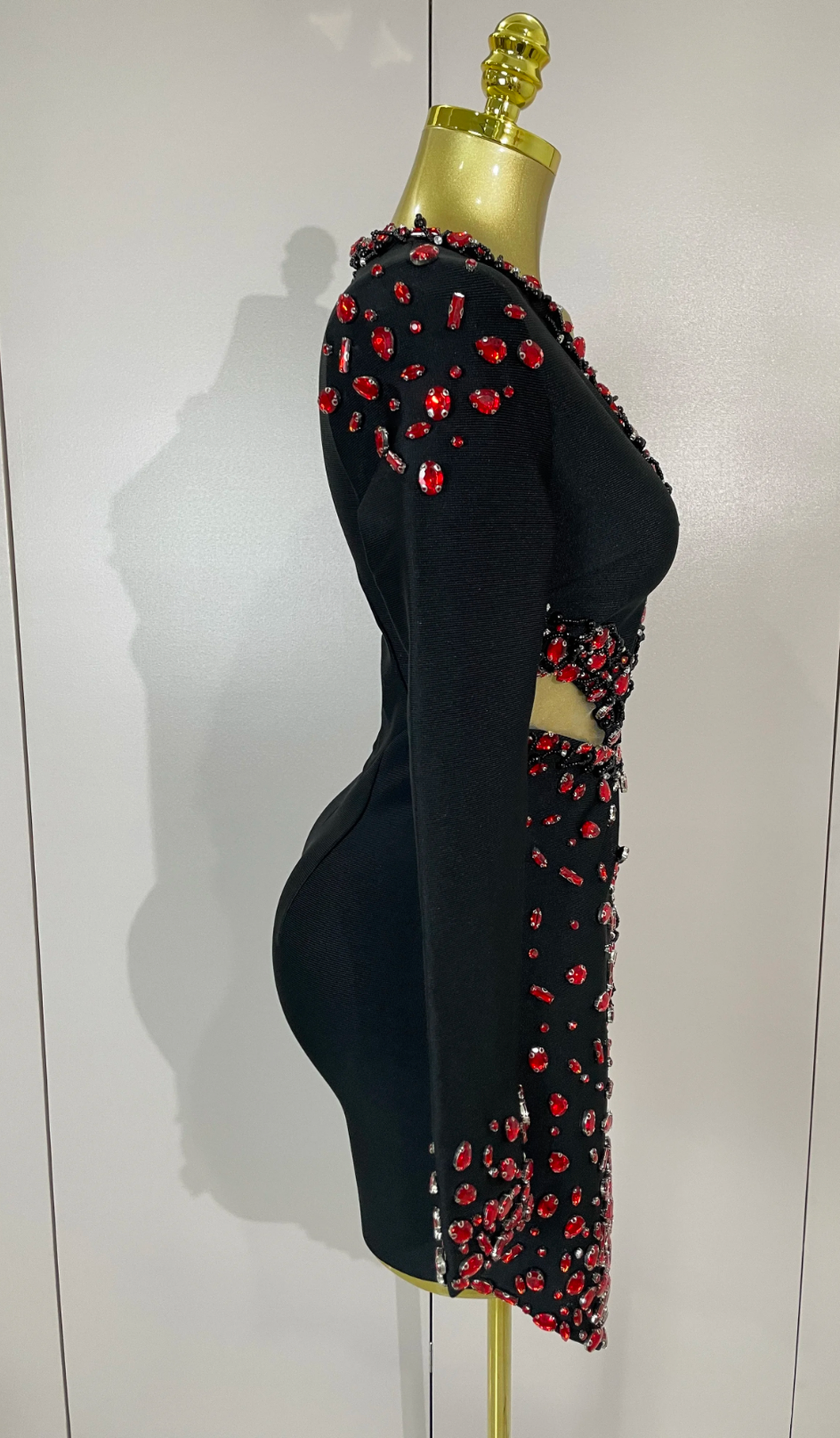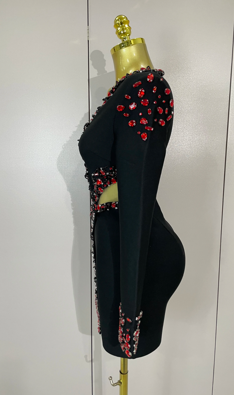 Celebrity-inspired black bandage mini dress with V-neck, long sleeves, and rhinestone beading. Perfect for evening parties and club nights.