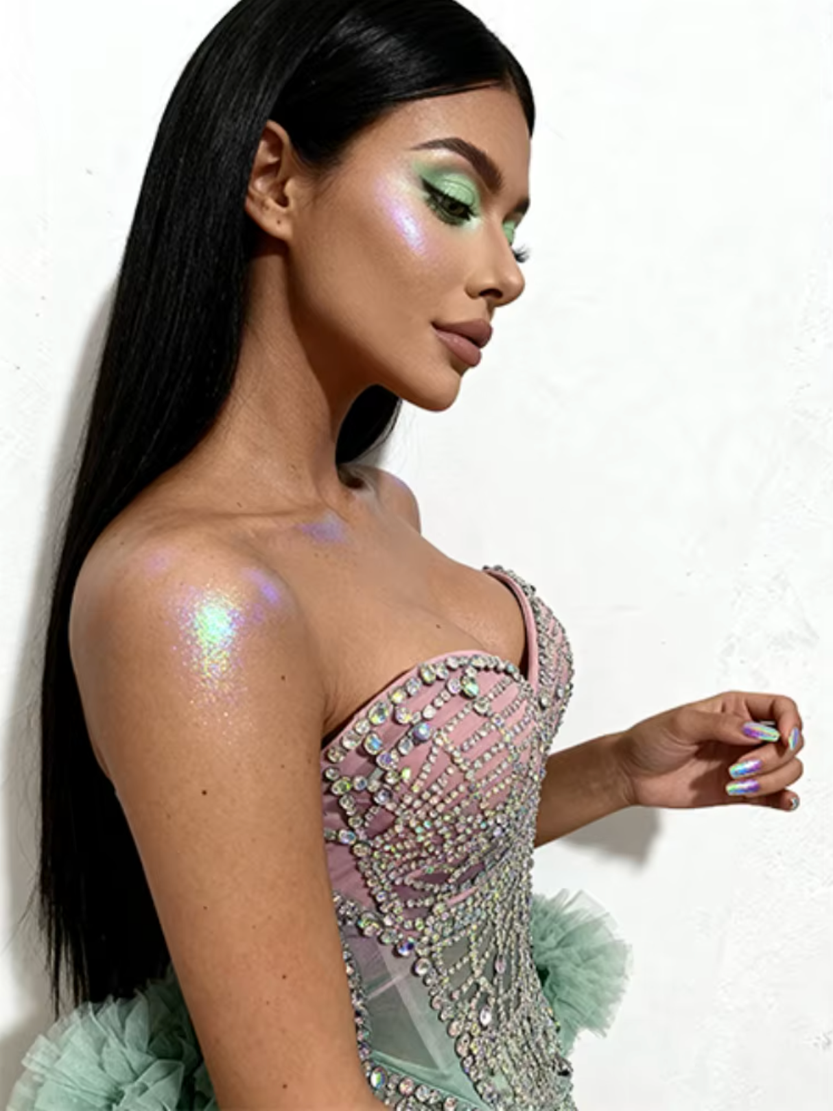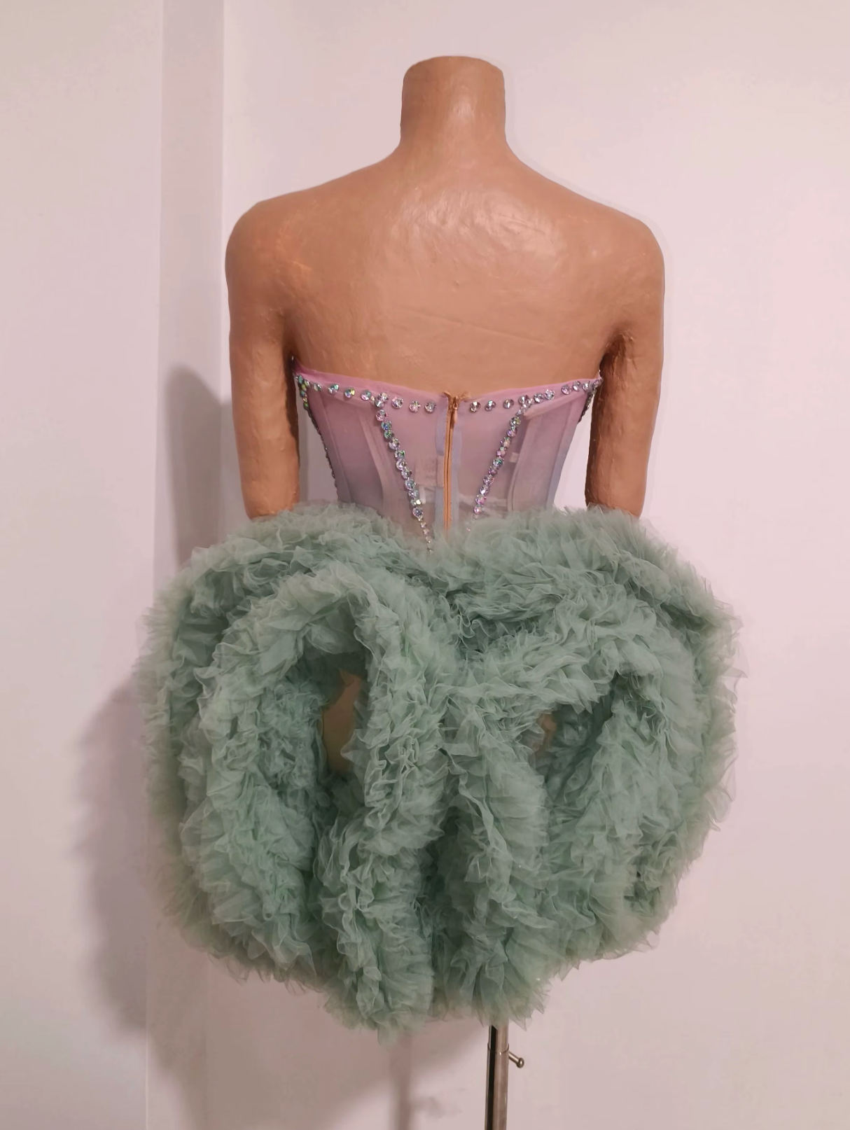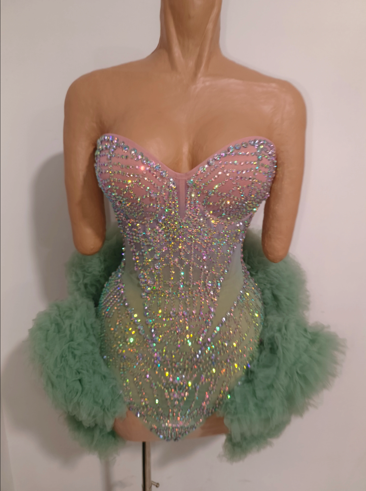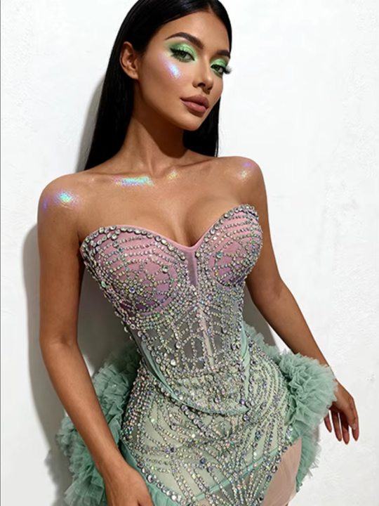 Women’s Sexy Strapless Green Mini Dress – Sparkly Crystal Performance Nightclub Party