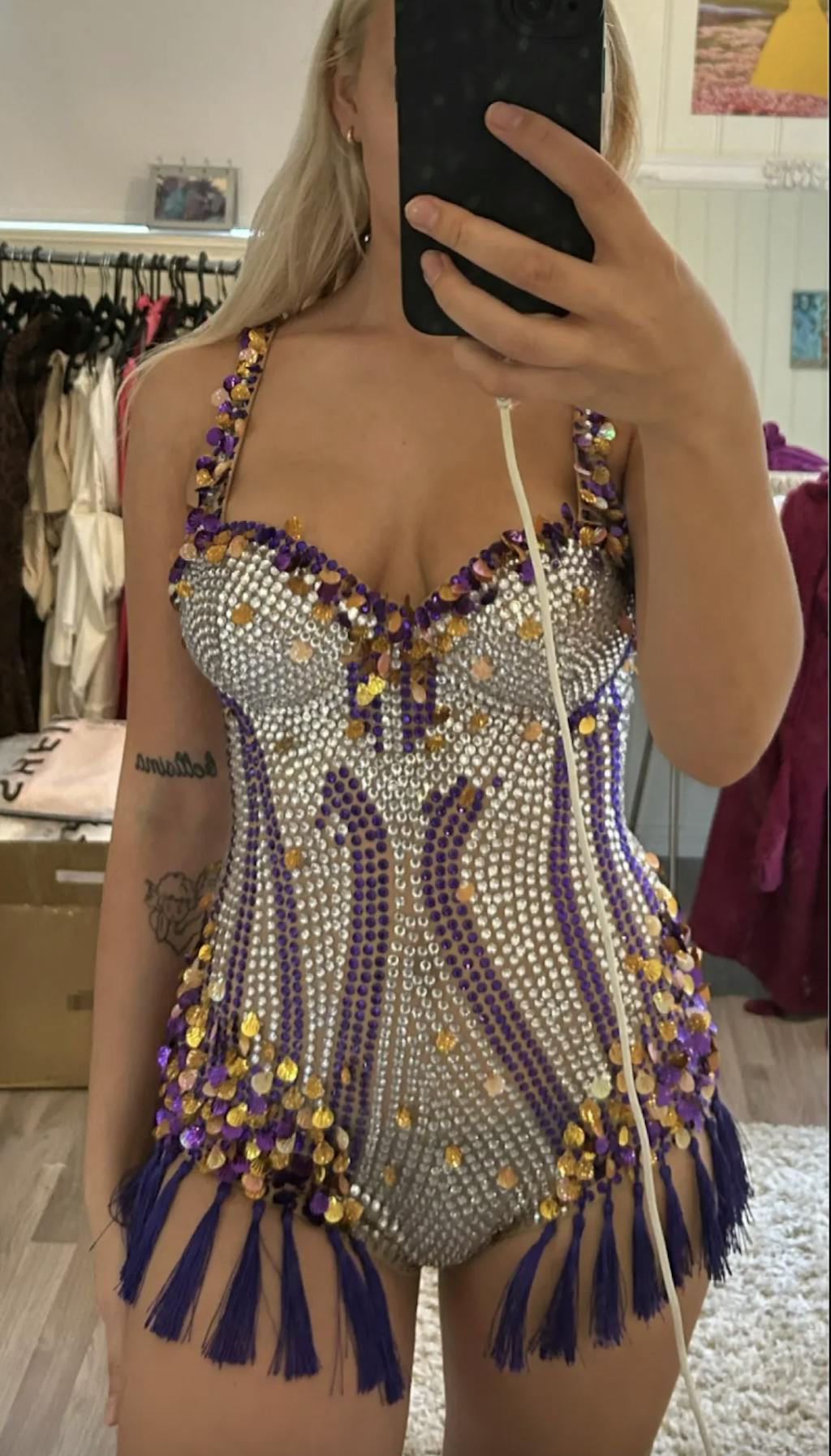 Yes, this purple rhinestone bodysuit is perfect for concert outfits, music festivals, and pop star-inspired fashion.