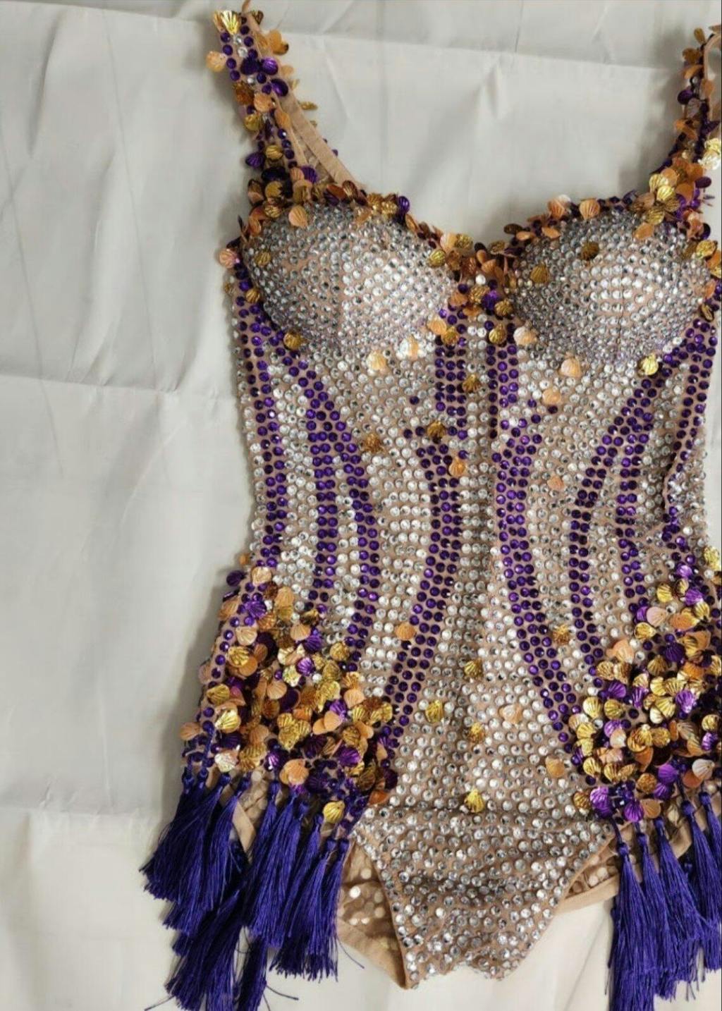 Purple Rhinestone Sequin Bodysuit – Concert Tour Inspired Sparkling Party & Performance Outfit