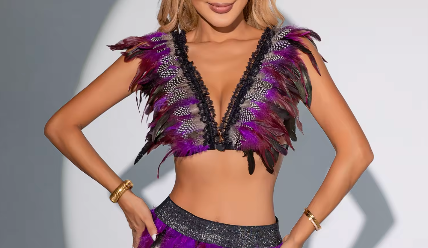 Make a bold entrance with this feather party top, designed for statement looks at high-energy events and celebrations.