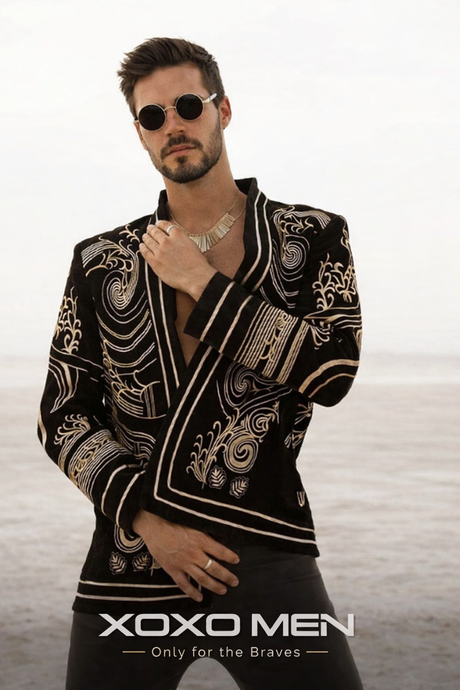 Make a powerful entrance with this men’s designer embroidered tuxedo blazer, crafted for upscale parties, cultural celebrations, and statement-making formal events. Featuring bold tribal-inspired embroidery and tailored structure, this luxury costume jacket blends traditional influence with modern high-fashion elegance.