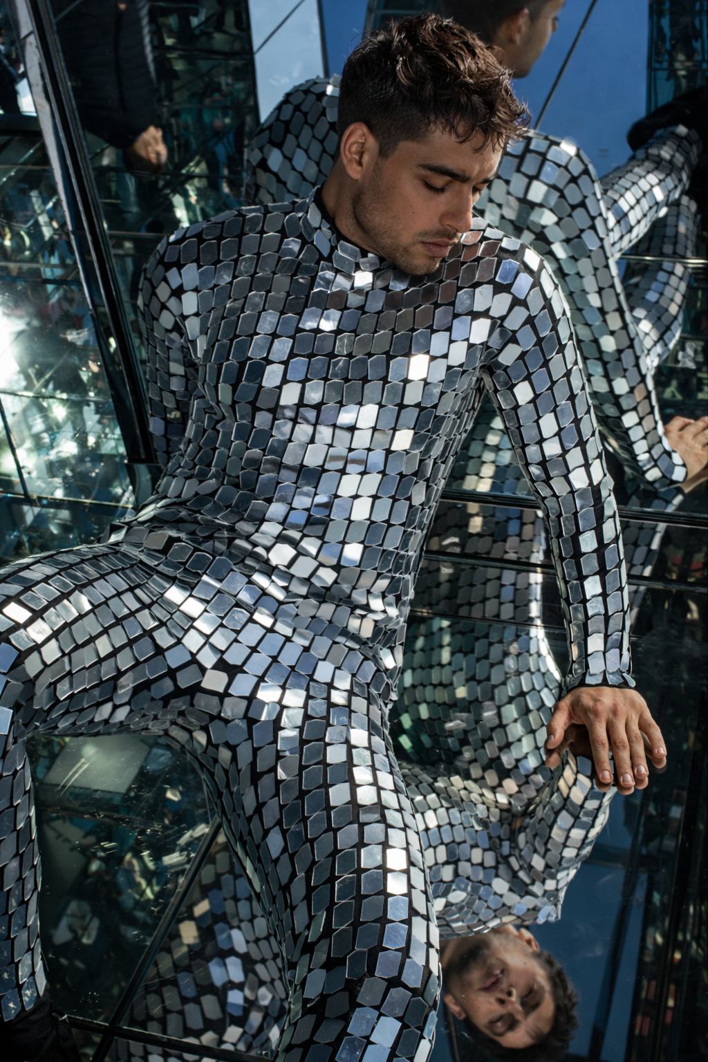 Make an unforgettable entrance in this men’s mirror jumpsuit catsuit, designed for bold DJ performances, futuristic festival looks, and high-energy party nights. Featuring a reflective mirrored finish and sleek fitted silhouette, this statement outfit is perfect for men’s party clothing, stage performances, and standout festival style.
