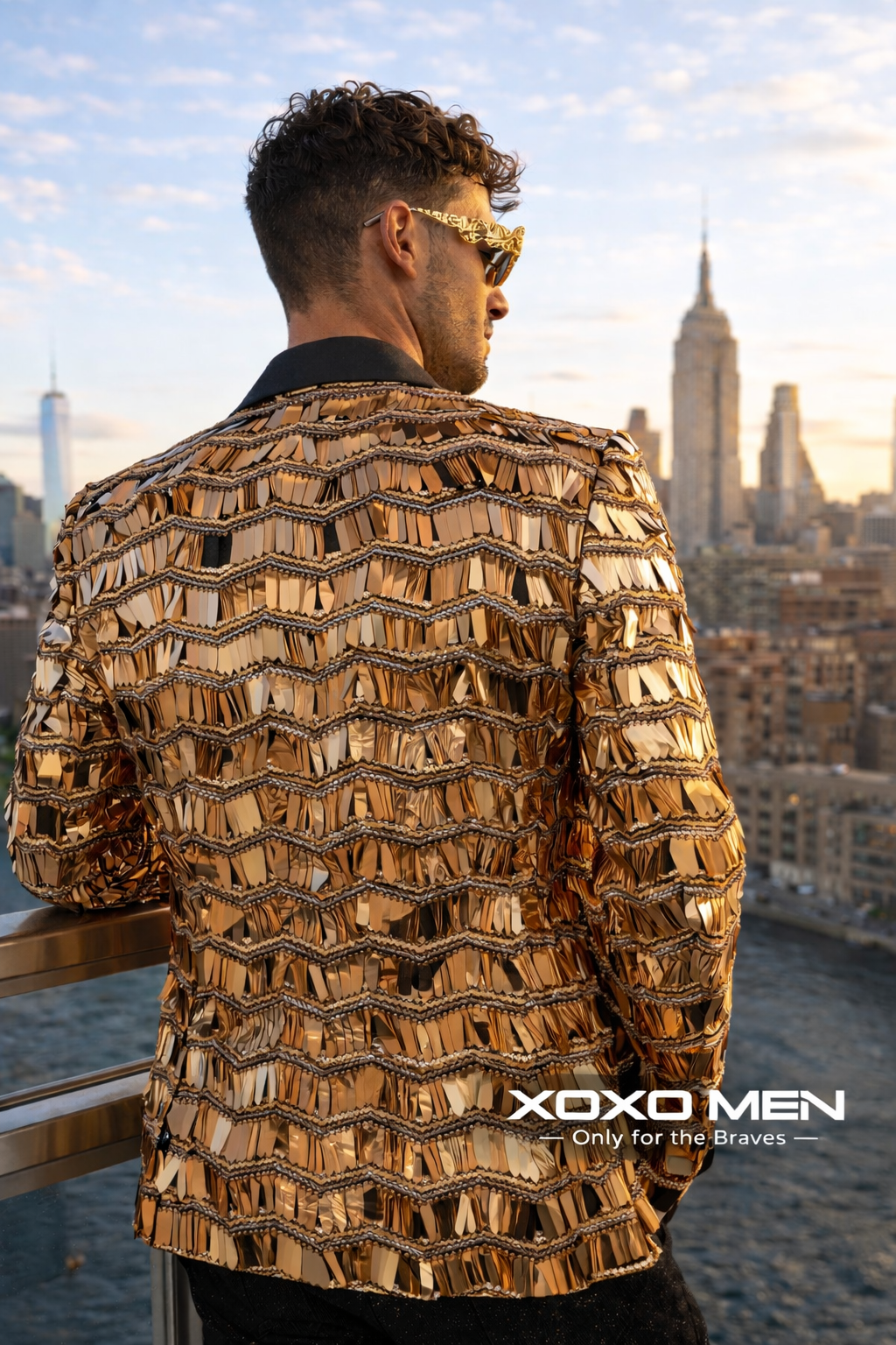 For festival styling, wear it over a fitted shirt or bare-chest layered look to achieve a confident, modern party aesthetic. The golden mirrored design evokes luxury, glamour and artistic expression, making it ideal for fashion-forward individuals who want to command attention effortlessly.