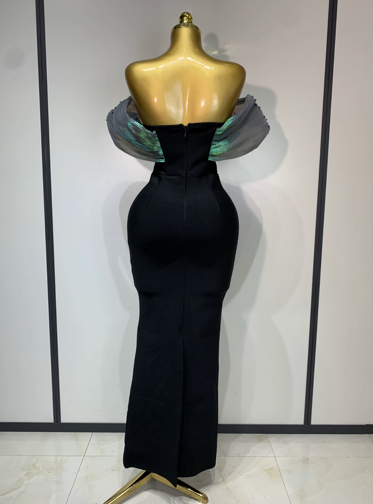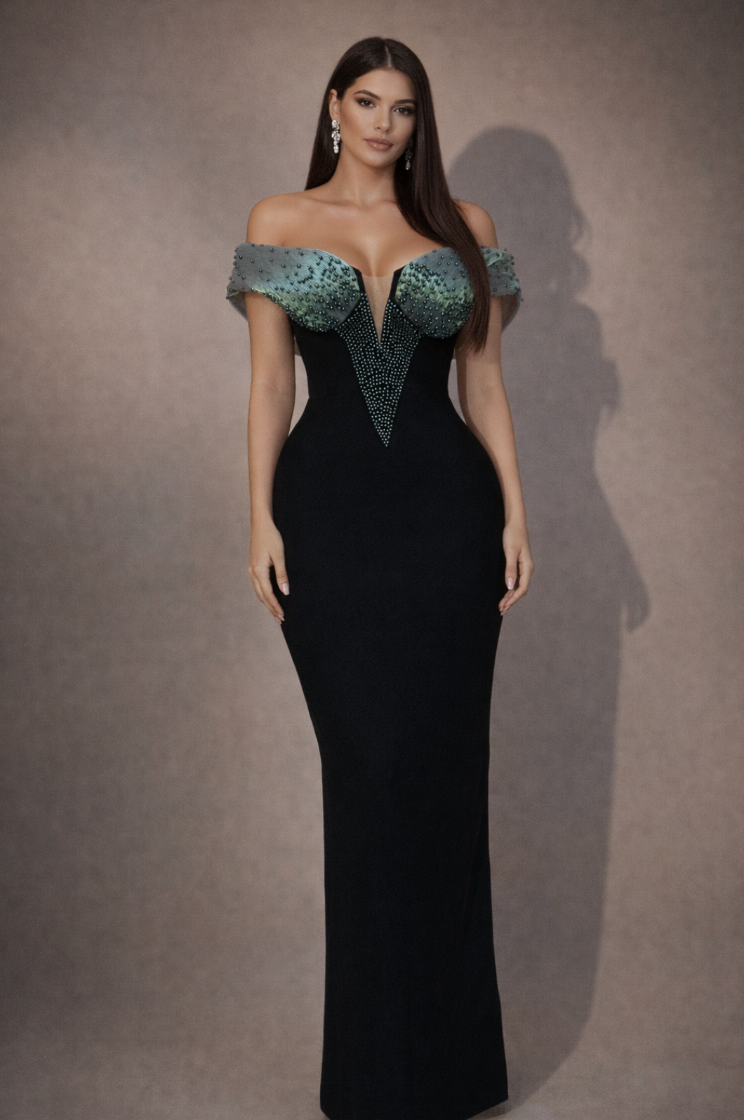 Off-Shoulder Black Sequin Dress Evening Gown with Green Beaded Bust & Sculpted Sleeves