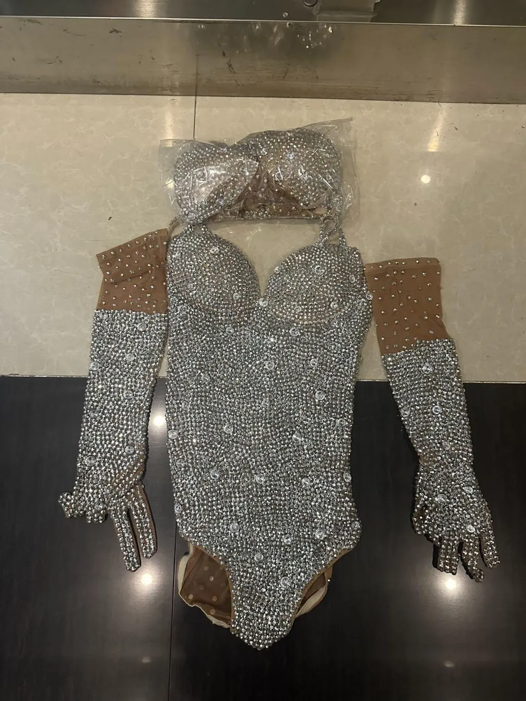 The sleek jumpsuit silhouette offers a sculpted fit while allowing freedom of movement—ideal for dancing, nightlife styling, and statement entrances. Whether worn for a night out, dance performance, or fashion-forward event, this crystal beaded jumpsuit blends luxury detail with confident, modern edge.