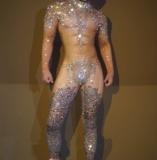 Dance Party Outfit Men's Jumpsuit Rhinestone Catsuit Dance Performance Burning Man Costume For Men