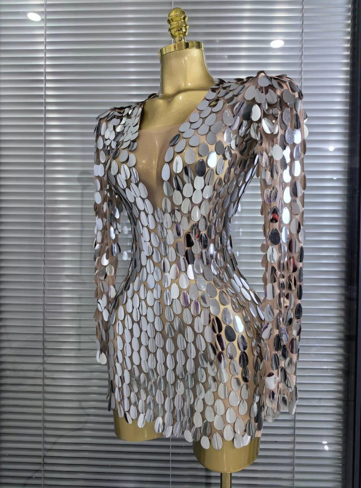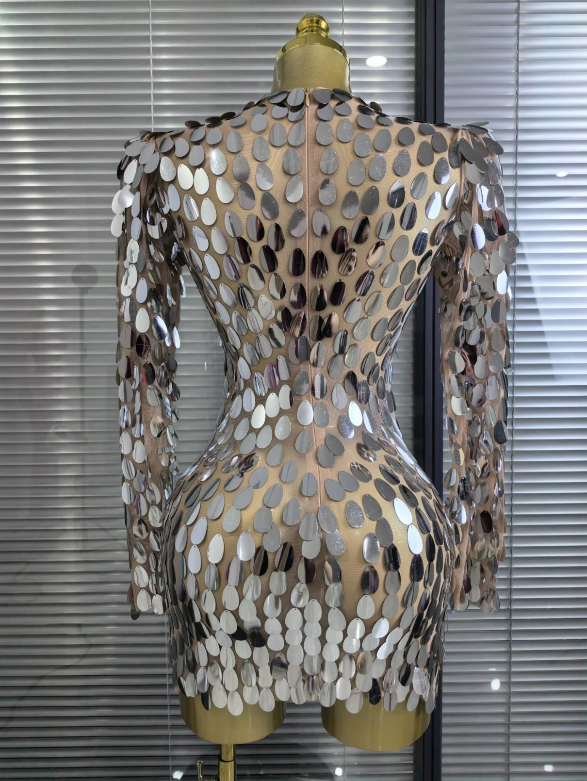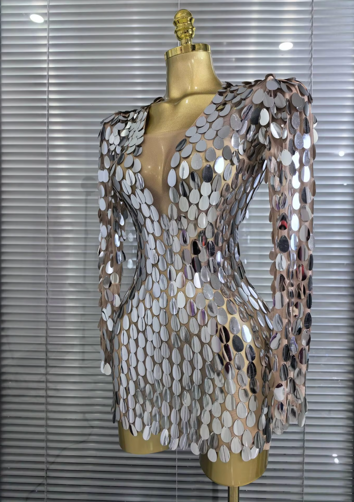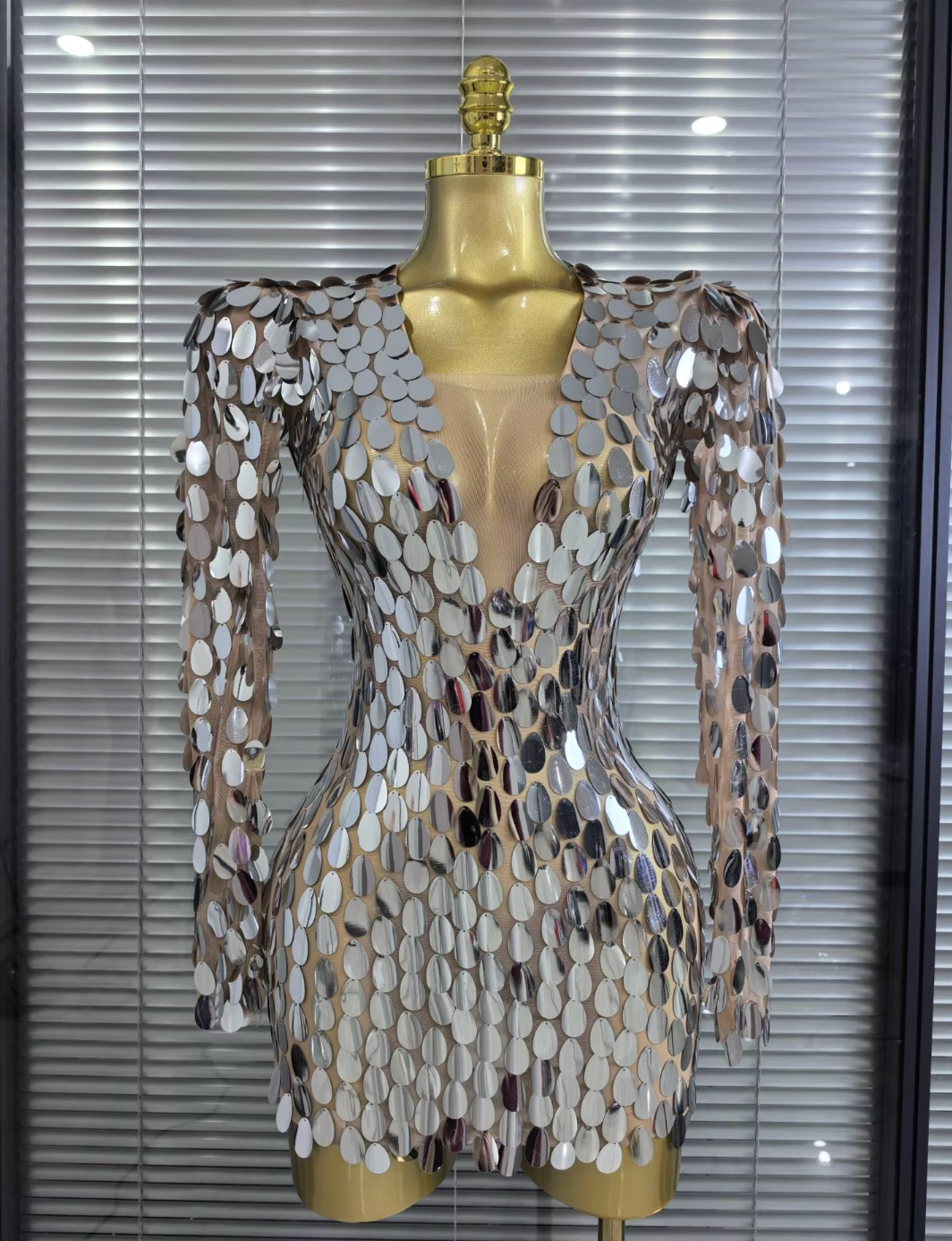 Step into the spotlight with our Shining Big Mirrors Women’s Long Sleeve Mesh Bodycon Mini Dress, designed for bold women who love to stand out at every event.