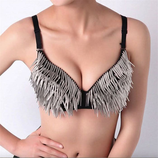 Metallic Bra : Music festival outfit & Vegas stage performance costume Black & Silver sleeves tassel covered with silver stars & pearls Size: S, M, L, XL S