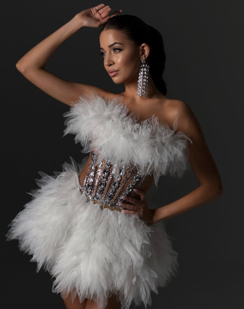 The corset design shapes and supports the silhouette, while the feather accents add dynamic texture—perfect for singers, dancers, nightclub performances, and bridal-inspired stage looks. Whether styled for a performance, special event, or standout celebration, this feather corset dress delivers confidence, sparkle, and unforgettable presence.