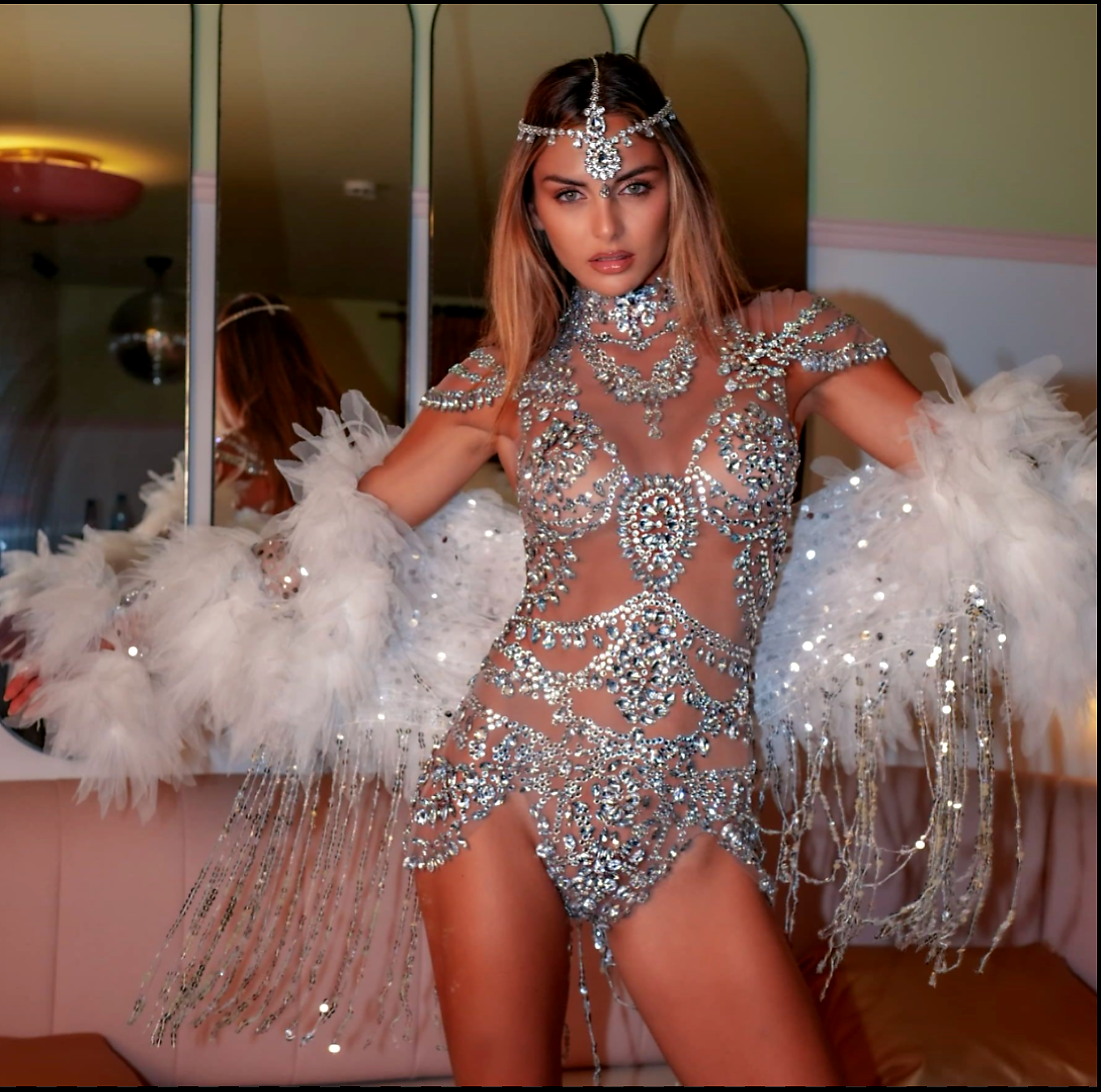Rhinestone Bustier Swarovski Crystal Cumpleaños Vestido Mono Show Girl Performance