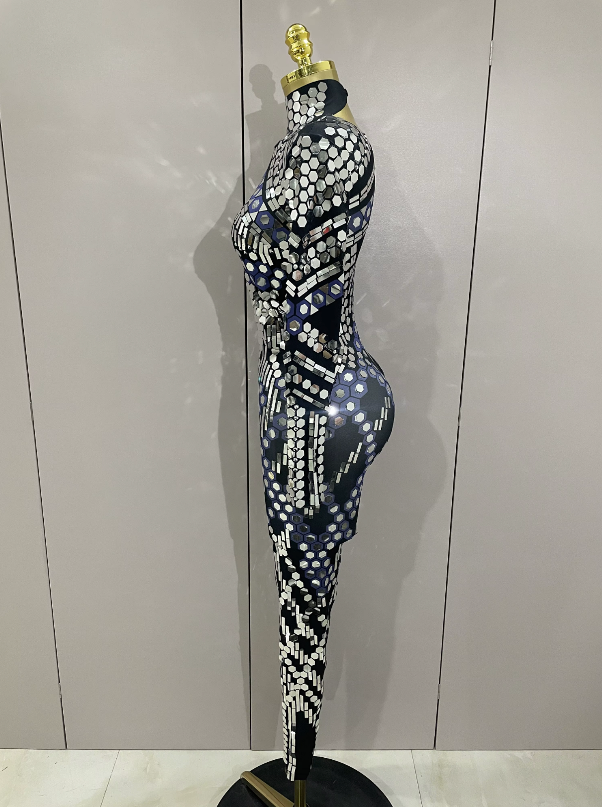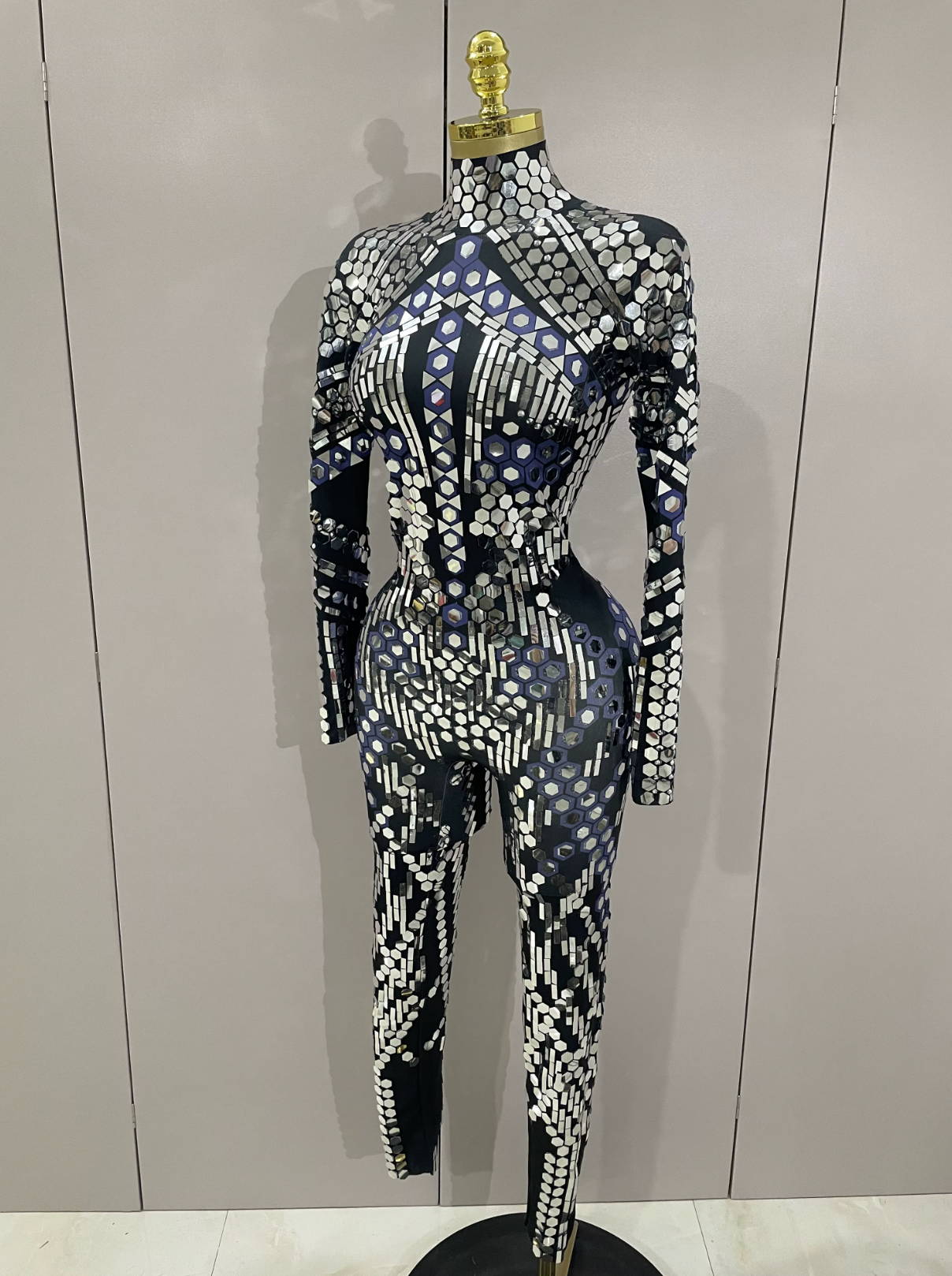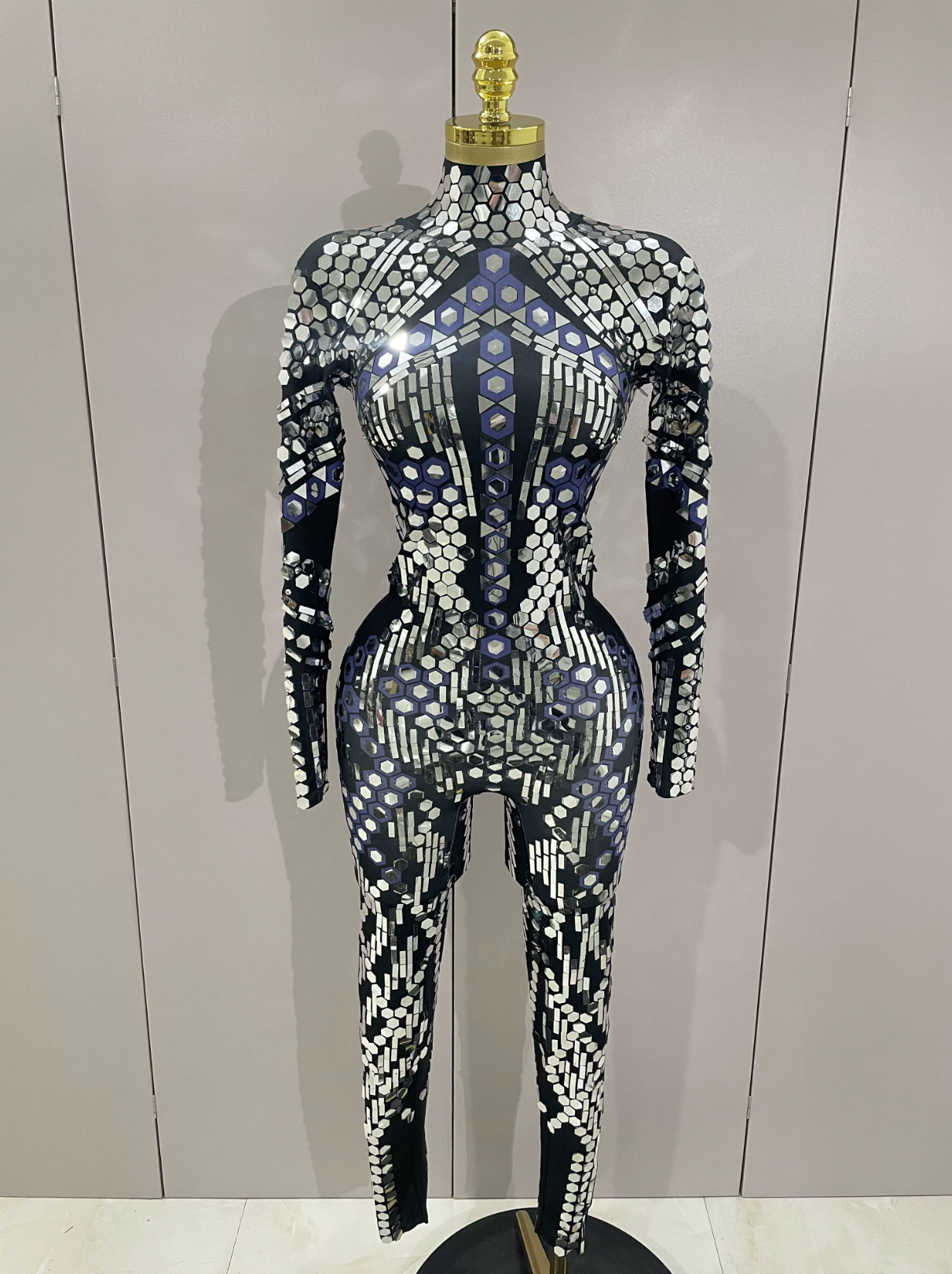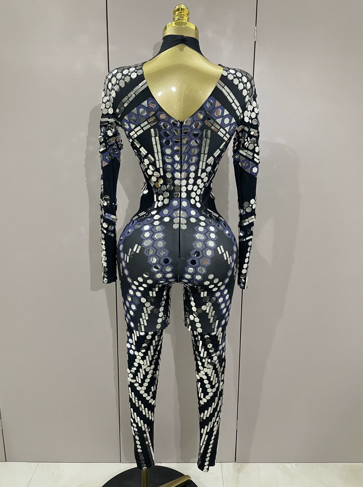 Mono de Festival Negro con Espejos Catsuit de Espejo Traje de Fiesta Vestuario de Actuación Atuendo de Festival