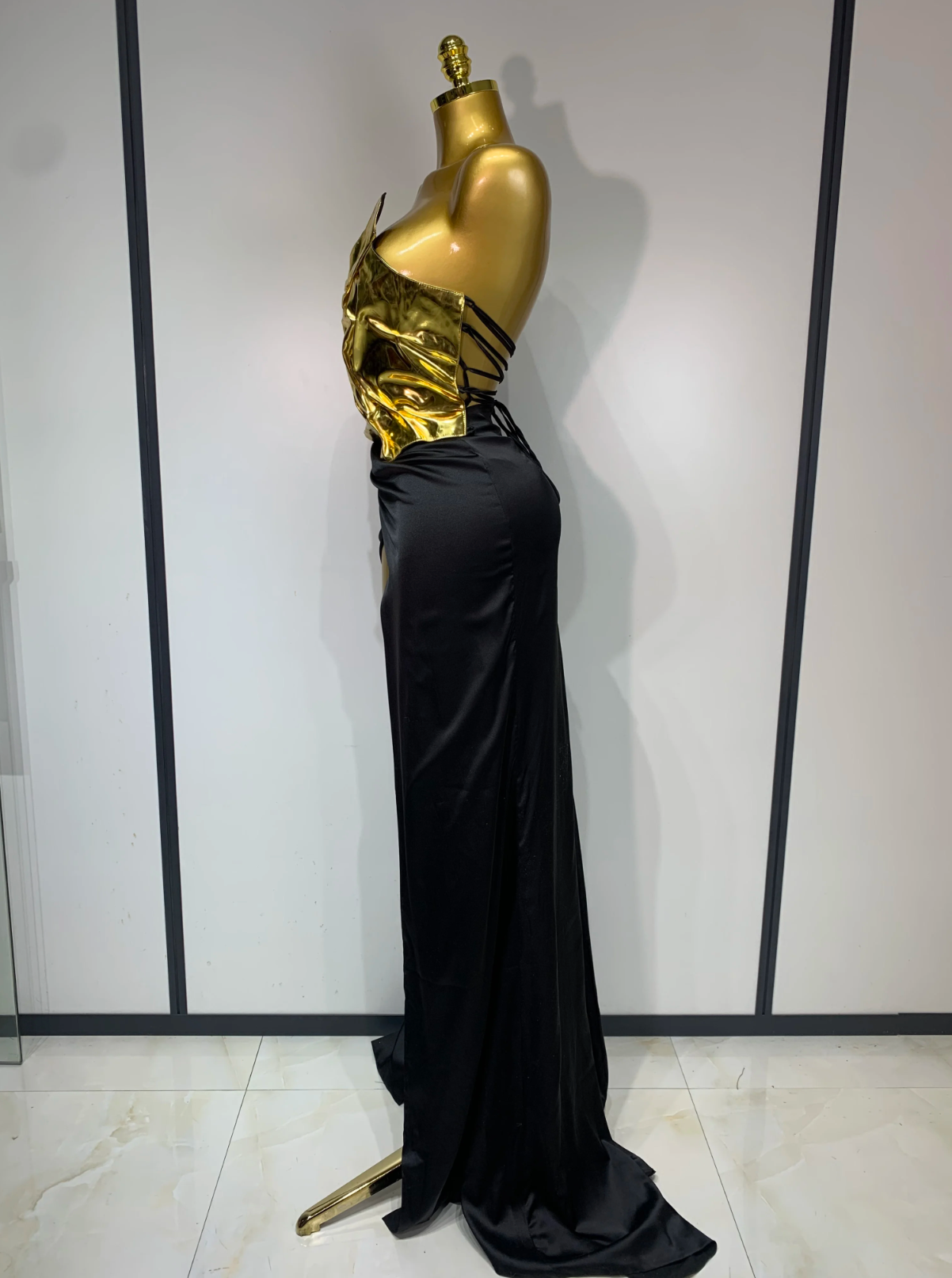Perfect for red carpet events, formal parties, birthday celebrations, evening galas, and upscale celebrations, this gold two-piece dress highlights the waist while creating a dramatic, elegant silhouette. Whether you’re attending a luxury party, special occasion, or formal evening event, this gold party gown is made to stand out under lights and cameras.