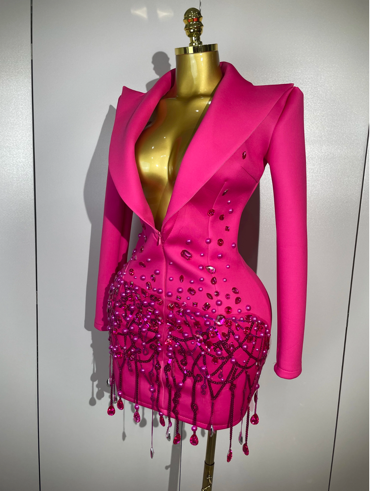 Affirmez votre style luxueux avec audace. robe mini à manches longues en chaîne de cristal doré et perles, disponible en élégant noir et roseConçue pour scintiller sous les projecteurs, cette mini-robe ornée de chaînes en cristal doré drapées et de perles rehaussera votre look pour les soirées chics, les anniversaires et les événements en soirée.