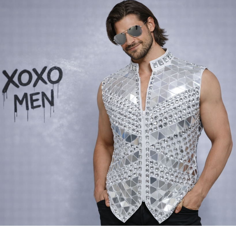 Entrez dans la lumière avec ça blazer sans manches à effet miroir disco pour homme, conçus pour des looks de soirée audacieux et des événements dynamiques ✨🕺Avec sa finition miroir réfléchissante et sa coupe ouverte sans manches, ce blazer tendance est parfait pour tenues de soirée pour hommes, vêtements de club et style festivalier remarquable.