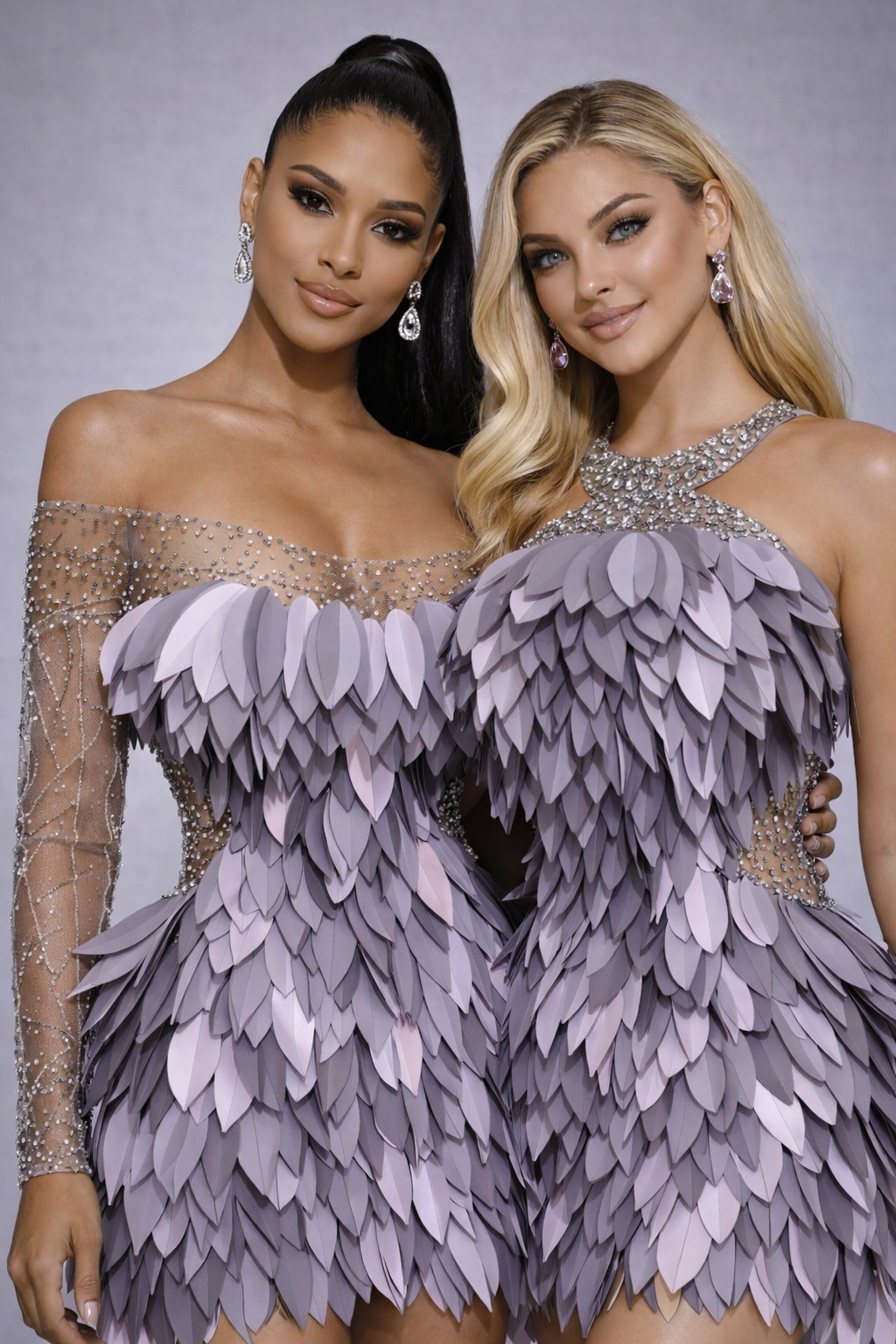 Robe Courte Grise Plumes Illusion Strass – Look de Soirée Éditorial à Manches Courtes