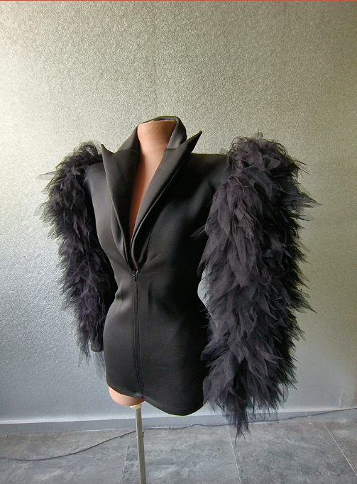 Robe Blazer de soirée noire moelleuse, tenue de soirée, Costume de Performance Drag, plumes